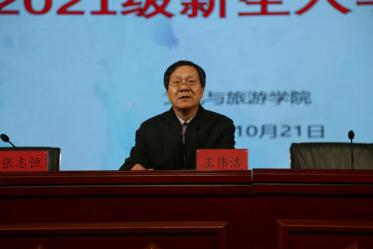 文化与旅游学院院长兼党总支书记王伟浩为新生讲授开班第一课。王伟浩首先代表全院教职工和老生,对652名新生表示热烈的欢迎。在简要介绍了洛阳和洛阳职业技术学院的基本情况之后,王伟浩要求新生们要按照“修身养德、强健体魄、锤炼技艺”的要求,首先学好做人,再学习做事。他要求同学们要与学校、老师同向而行,积极参与共同努力做好学院的教育教学,课外时间可以根据个人特长和意愿,选择适合自己的学生组织、社团、创新创业等组织或平台,立志成才,学有所成,不负三年韶华。