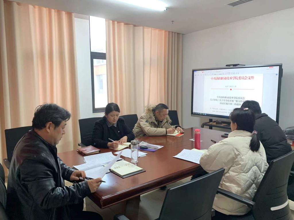 会上传达了《中共洛阳职业技术学院委员会关于在全校开展“能力作风建设年”活动实施方案》以及校党委书记朱美荣在开展“能力作风建设年”活动动员部署会议上的讲话精神。全体党员分别根据自身工作职责和实际进行发言和表态。