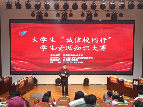 12月25日下午,以“昂首阔步新时代 树信立德展风采”为主题的洛阳职业技术学院“诚信校园行”学生资助知识大赛在我校大学生活动中心二楼心理剧场隆重举行。副院长张志友出席活动,学生处负责同志、各二级学院副书记、学工办主任及部分辅导员参加了本次大赛。