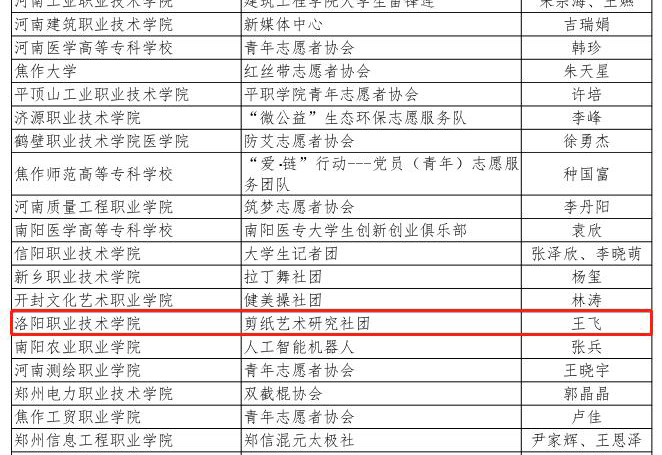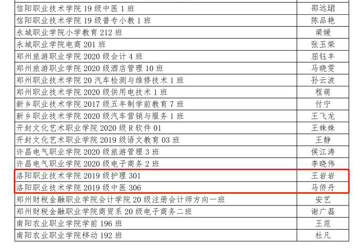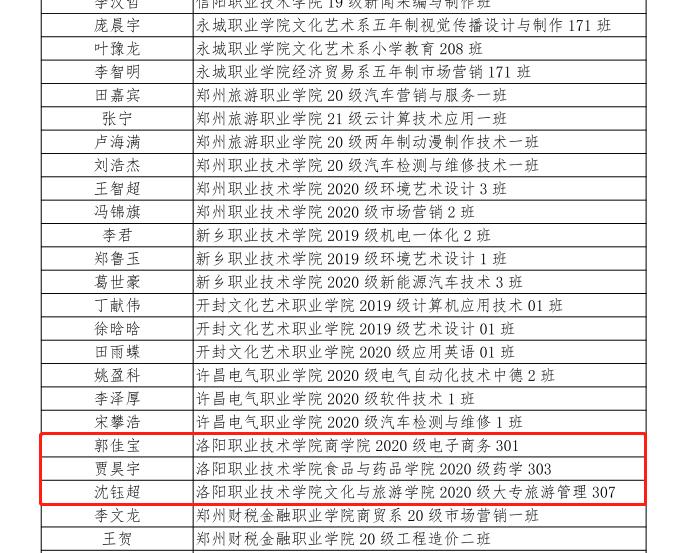 我校2019级护理301班和2019级中医306班获得“河南省文明班级”荣誉称号;5A-625和2B-416获得“河南省文明宿舍”荣誉称号;剪纸艺术研究社团获得“河南省文明社团”荣誉称号;文物保护考古学院教师侯贤俊和戏曲艺术学院教师王雪涛获得“河南省文明教师”荣誉称号;商学院2020级电子商务301班学生郭佳宝、食品与药品学院2020级药学303班学生贾昊宇、文化与旅游学院2020级大专旅游管理307班沈钰超获得“河南省文明学生”荣誉称号;党委宣传部常书香荣获“河南省文明网民”荣誉称号。