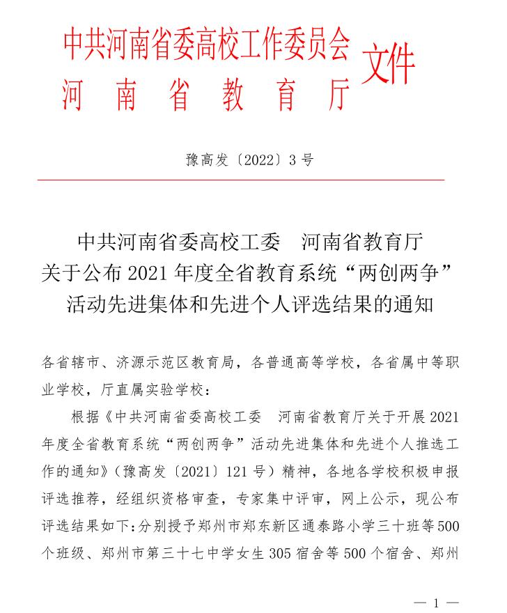 2021年10月15日,省委高校工委、省教育厅组织开展了全省教育系统“两创两争”先进集体和先进个人评选工作,经过评审最终选出“河南省文明班级”、“河南省文明宿舍”、“河南省文明社团”、“河南省文明教师”、“河南省文明学生”、“河南省文明网民”等先进集体和先进个人。