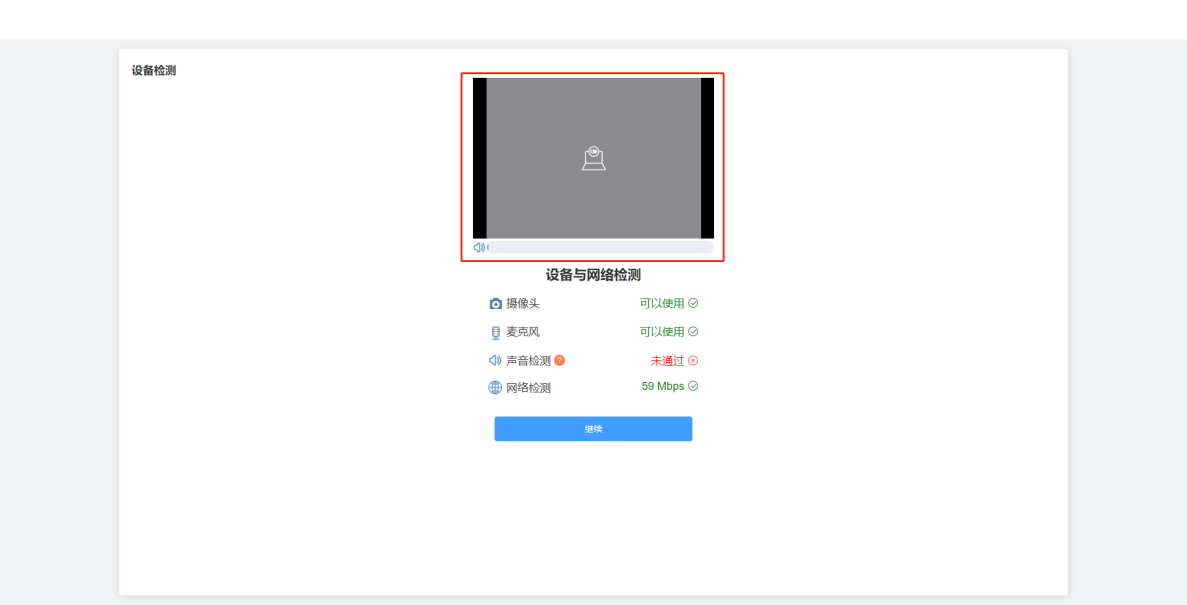 声⾳检测需要考⽣对着⻨克⻛说话检测⾳量条(下图所示)是否变化,四项检测通过后点击继续即可开始测试。