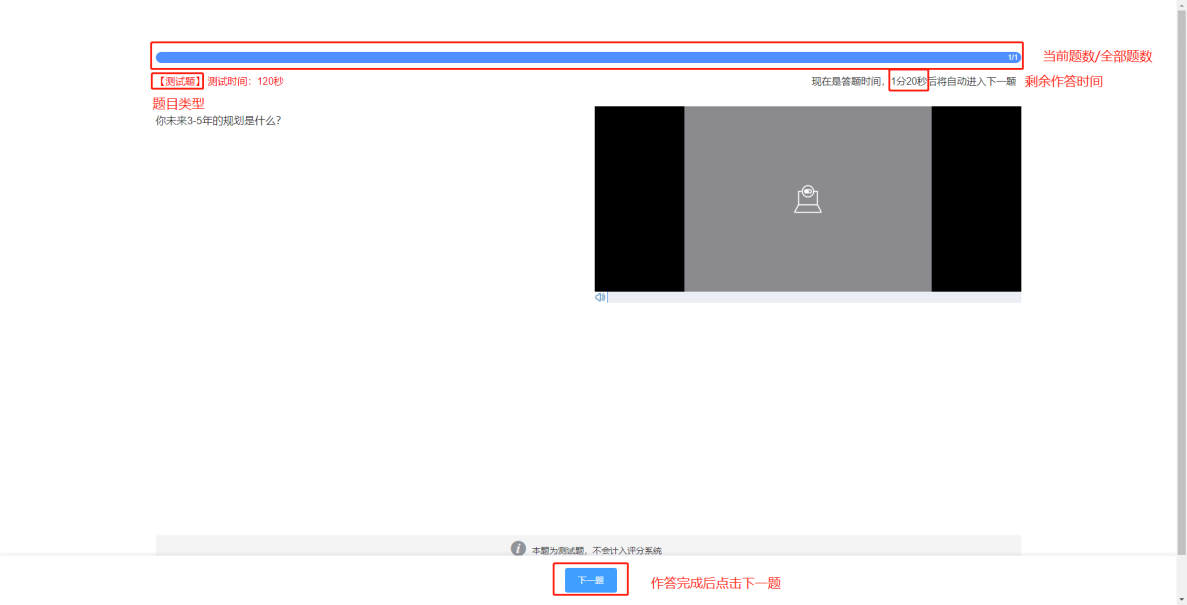 作答完成后点击下⼀题请中着重检查视频当中声⾳⾳量是否合适,可根据实际情况进⾏重新作答,或点击开始答题。