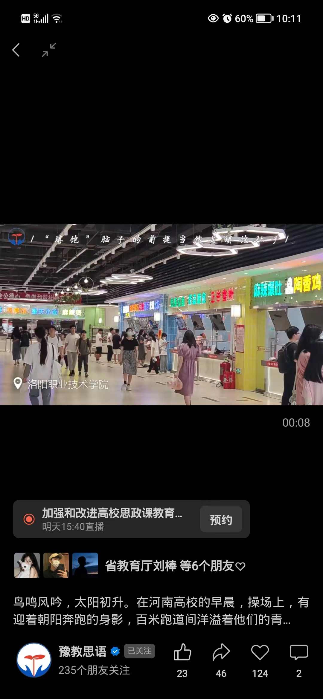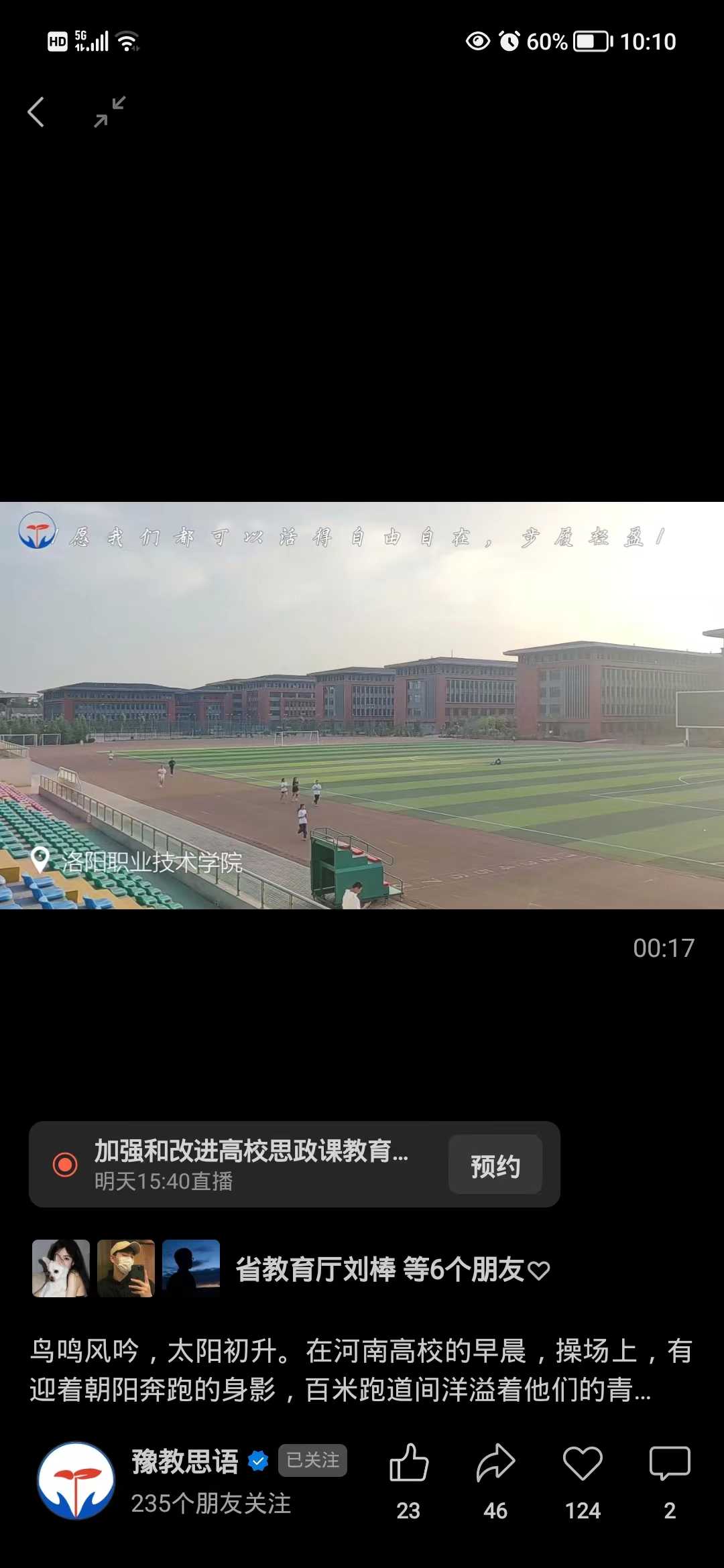 2022年5月2日,豫教思语官方视频号发布鸟鸣风吟,太阳初升,河南高校的早晨。有我校早晨视频。原视频如下: