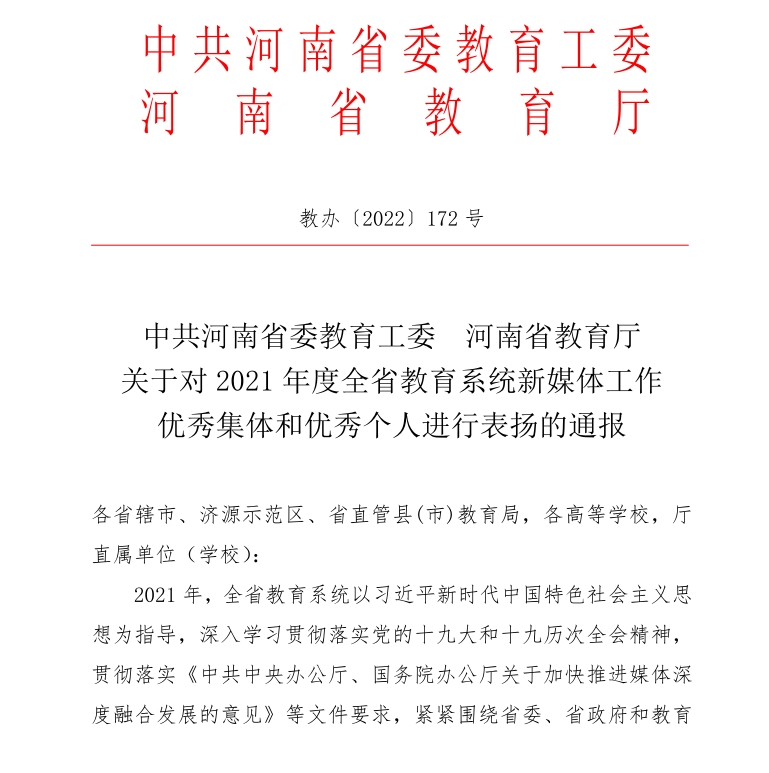近日,河南省委教育工委、河南省教育厅对2021年度全省教育系统新媒体工作优秀集体和优秀个人进行了通报表扬,我校官方微信入选河南省高职高专政务微信前五名,党委宣传统战部宣传科科长常书香被评为高职高专新媒体工作优秀个人。