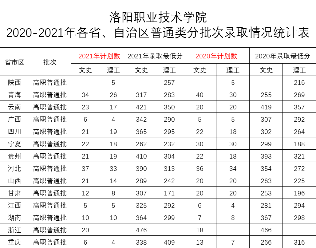 洛阳职业技术学院2020-2021年外省招生计划及录取最低分数查询