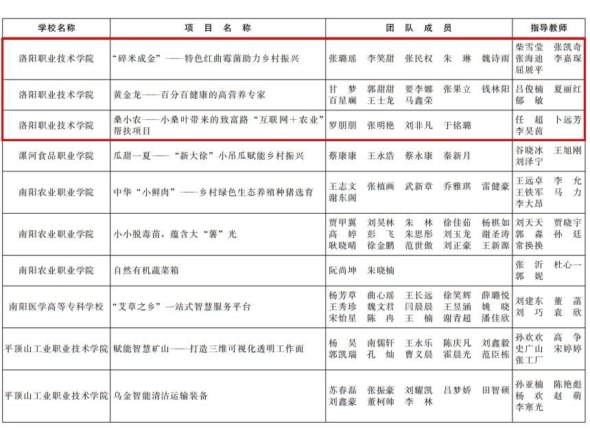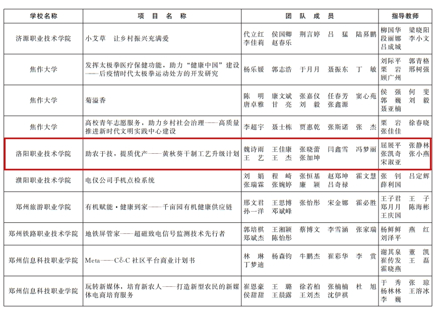 我校参赛项目《助农于技,提质优产——黄秋葵干制工艺升级计划》荣获职业院校组金奖,《“碎米成金”——特色红曲霉菌助力乡村振兴》等三个参赛项目荣获职业院校组银奖,《“豫”见国花 慧动洛城 用物联网技术助力“智慧牡丹”产业》等22个参赛项目荣获职业院校组铜奖。我校荣获此次竞赛“优胜杯”。