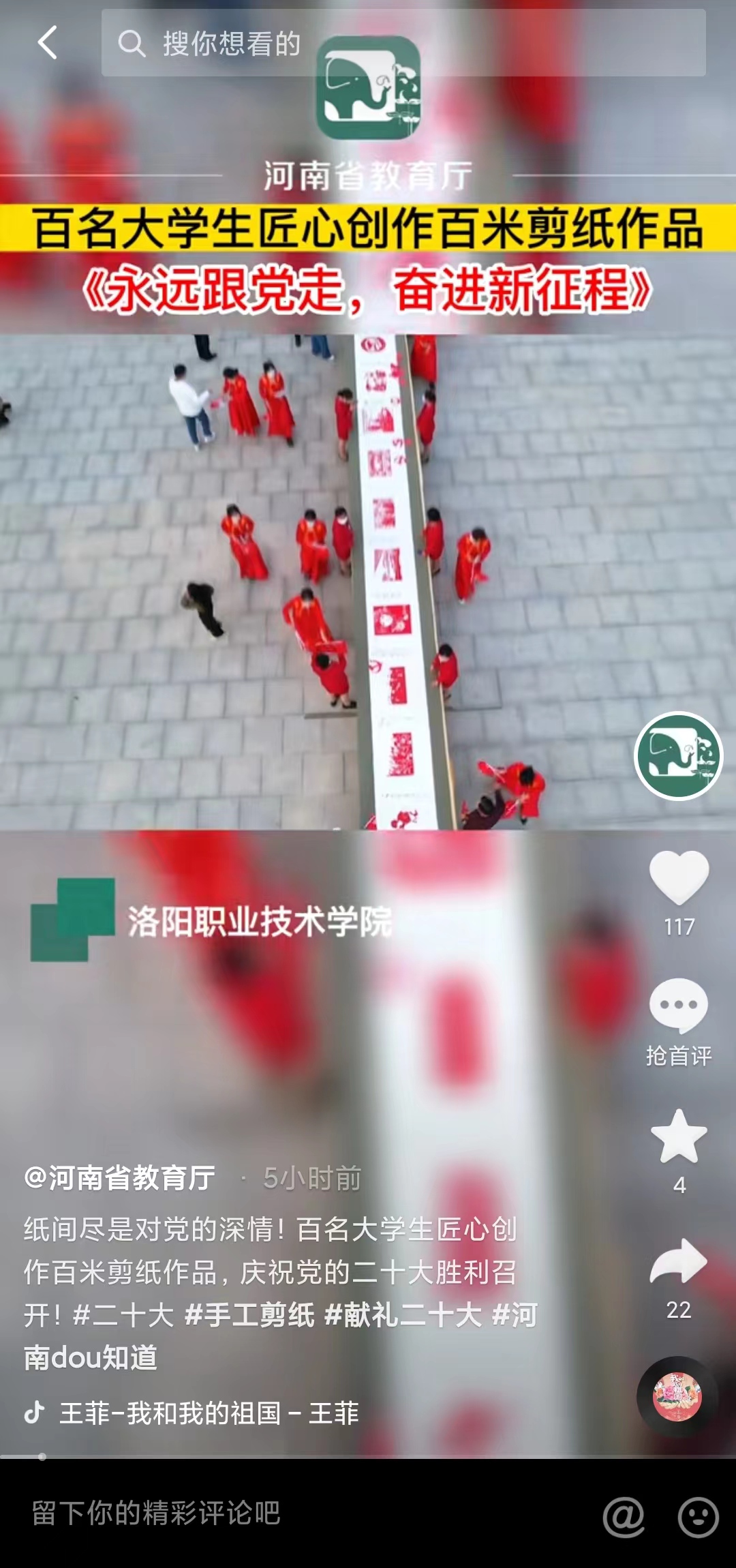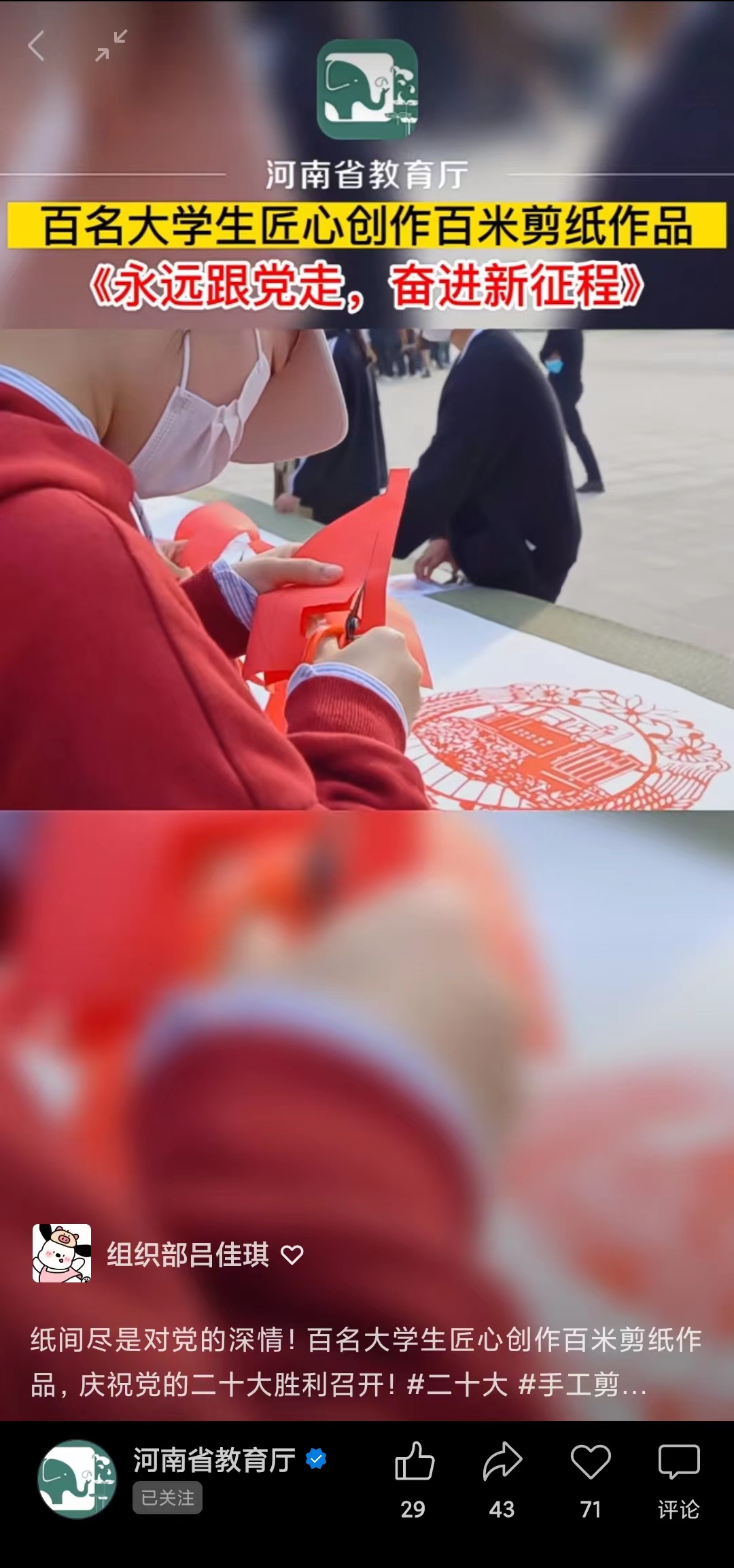 编者按:2022年10月22日,河南省教育厅抖音号、视频号报道我校百名大学生匠心创作百米剪纸作品。报道原视频及相关链接如下: