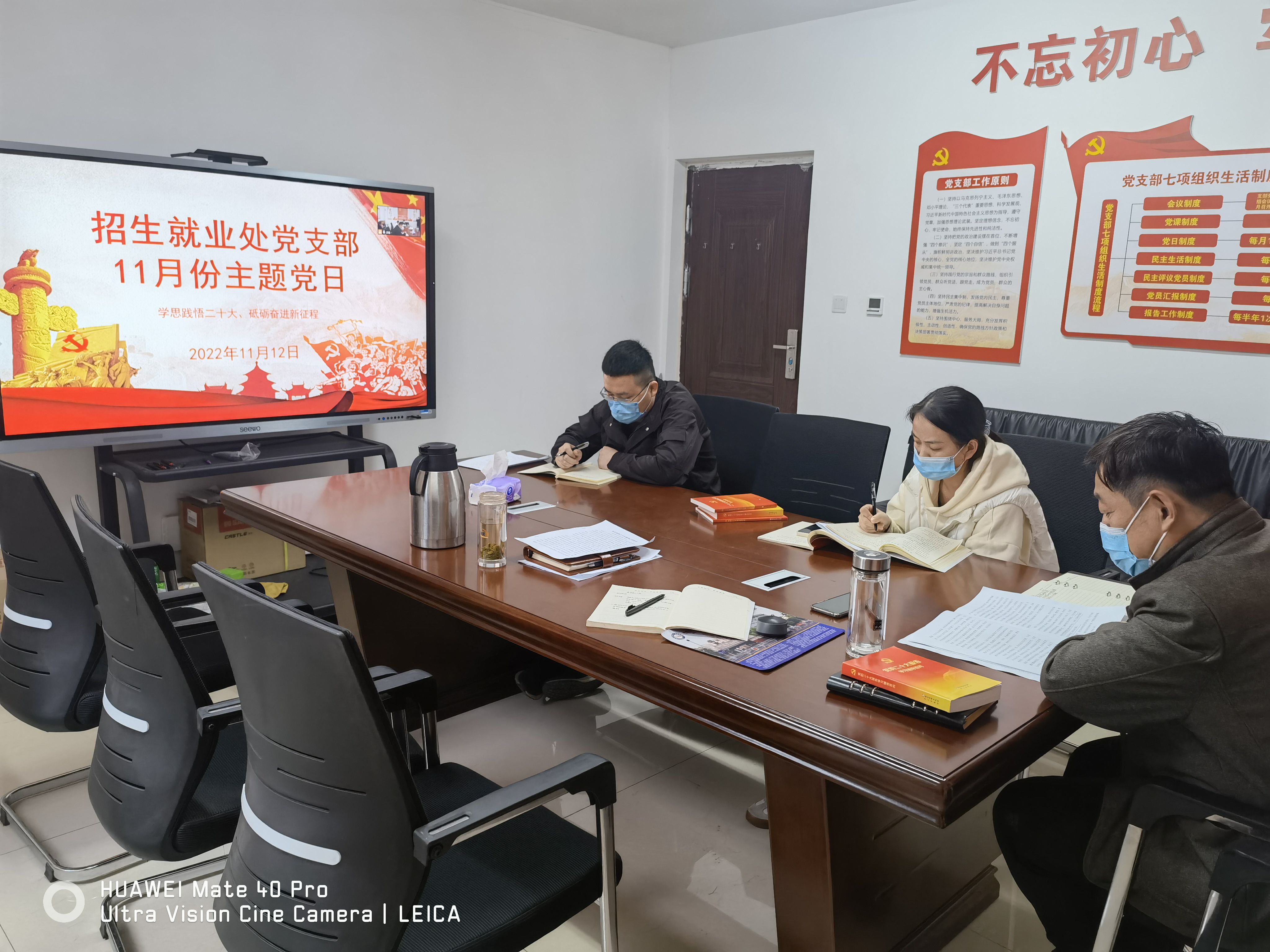 11月12日,招生就业处党支部在大学生活动中心3-10A会议室召开主题党日活动,学习党的二十大报告,会议由党支部书记宋来炜主持,全体党员参加了此次会议。