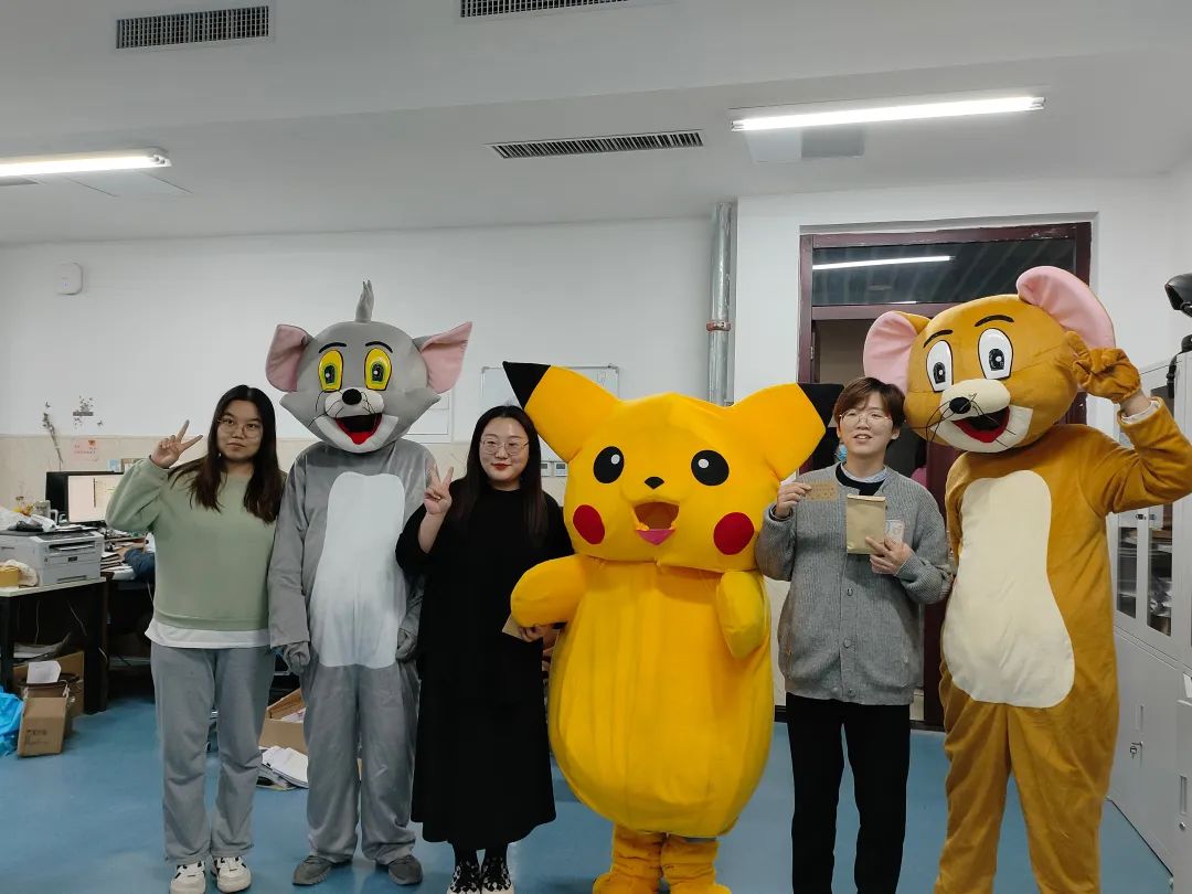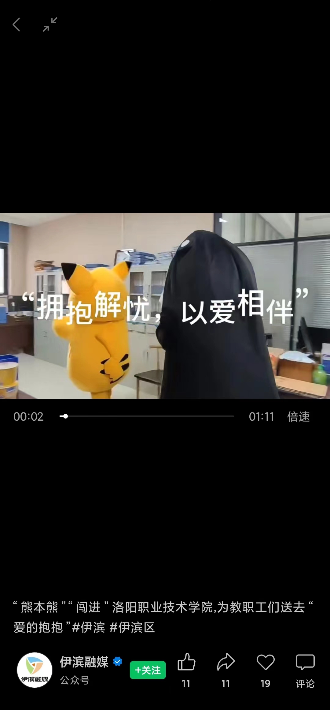 “杨老师,您辛苦啦!快来拥抱一下吧!”近日,在洛阳职业技术学院里,有四个身穿“熊本熊”和“皮卡丘”等毛绒衣服的卡通人偶,正在为坚守在岗位上的老师们送去“爱的抱抱”。它们看起来又大又圆,摸上去手感毛茸茸的,十分可爱。