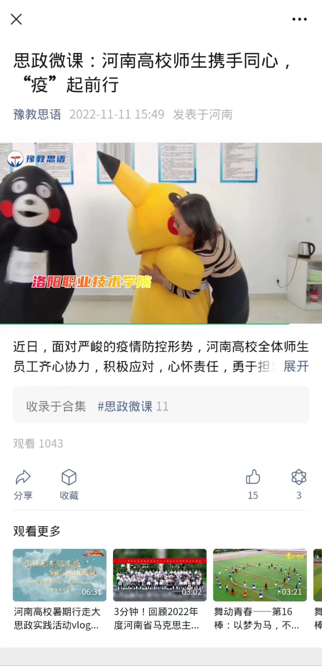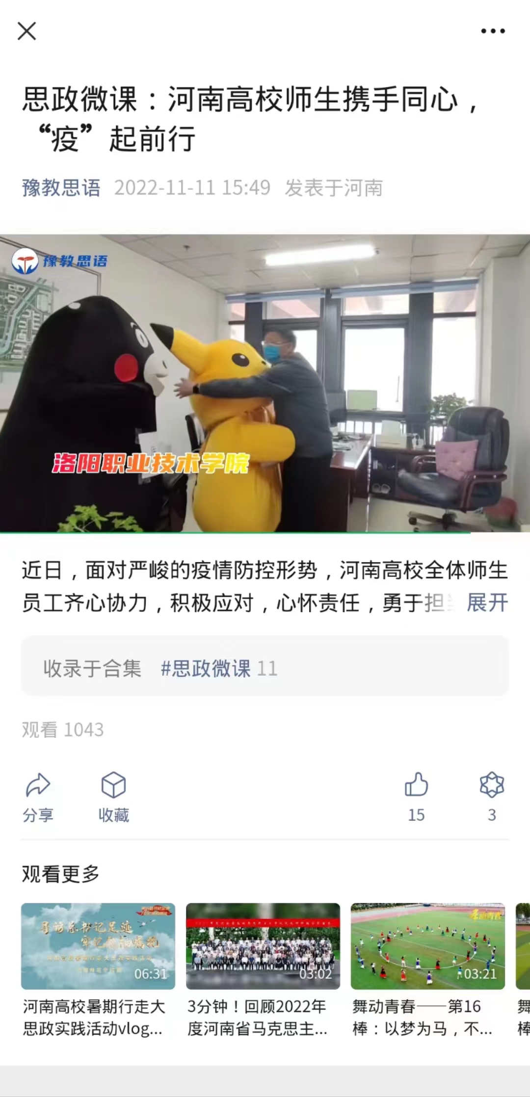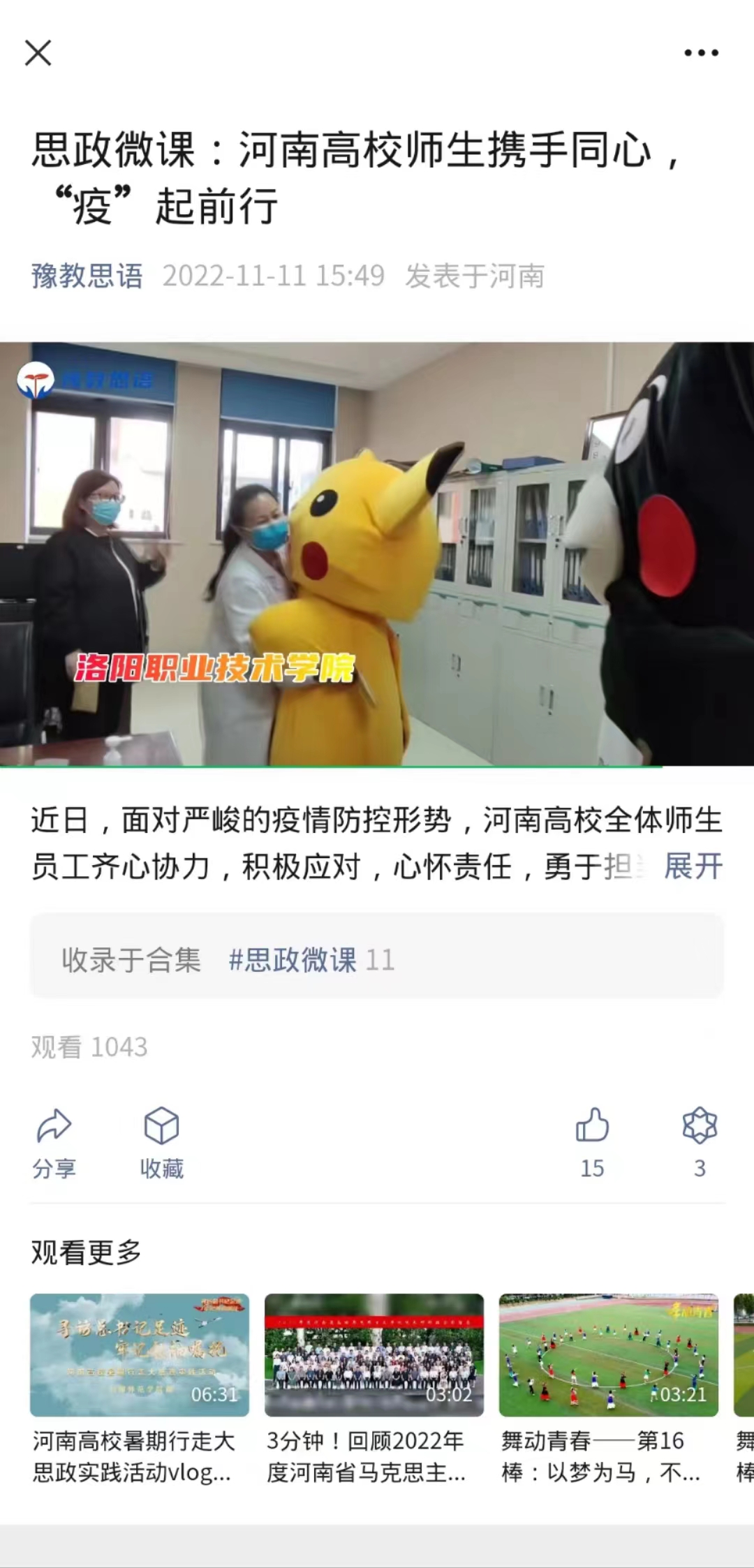 编者按:2022年11月11日,豫教思语微信公众号报道思政微课:河南高校师生携手同心,“疫”起前行,其中有我校默默付出的校园守护者。报道原文及相关链接如下: