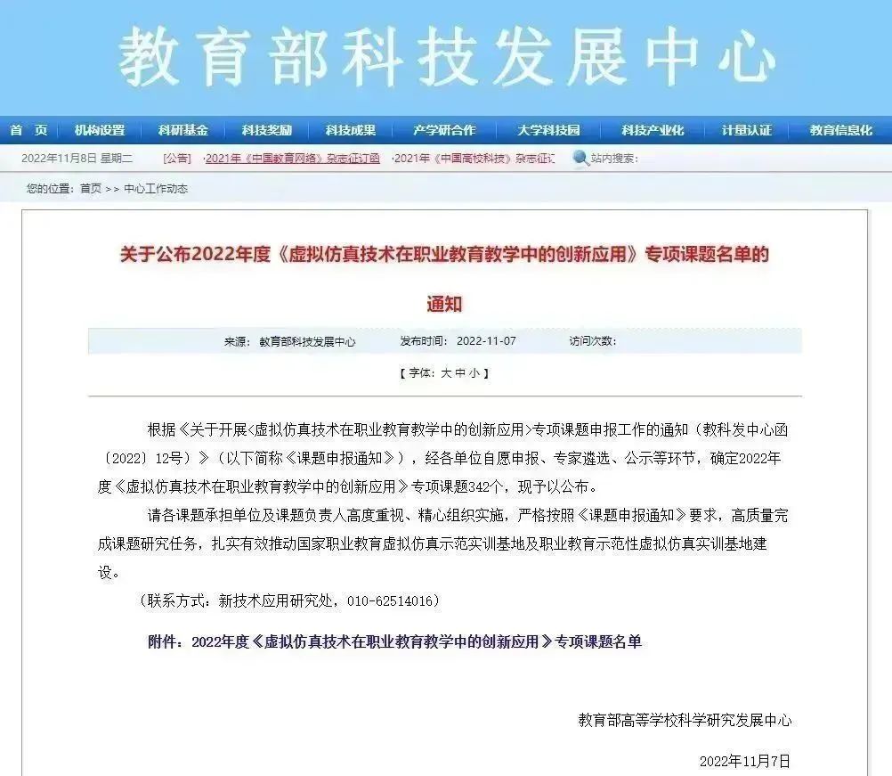 为贯彻落实《国家创新驱动发展战略纲要》《国家职业教育改革实施方案》《职业教育提质培优行动计划(2020-2023年)》等文件精神,助力职业教育数字化升级,探索虚拟仿真赋能职业教育教学的新思路、新模式、新机制,进一步推动国家职业教育虚拟仿真示范实训基地及职业教育示范性虚拟仿真实训基地建设,教育部高等学校科学研究发展中心于今年7月份拟立项一批《虚拟仿真技术在职业教育教学中的创新应用》专项课题。经各单位自愿申报、专家遴选、公示等环节,共确定2022年度《虚拟仿真技术在职业教育教学中的创新应用》专项课题342个。