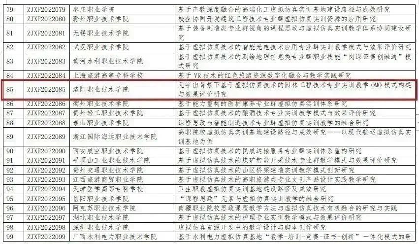 11月7日,教育部科技发展中心公布了2022年度《虚拟仿真技术在职业教育教学中的创新应用》专项课题名单,洛阳职业技术学院申报课题《元宇宙背景下基于虚拟仿真技术的园林工程技术专业实训教学OMO模式构建与效果评价研究》名列其中。