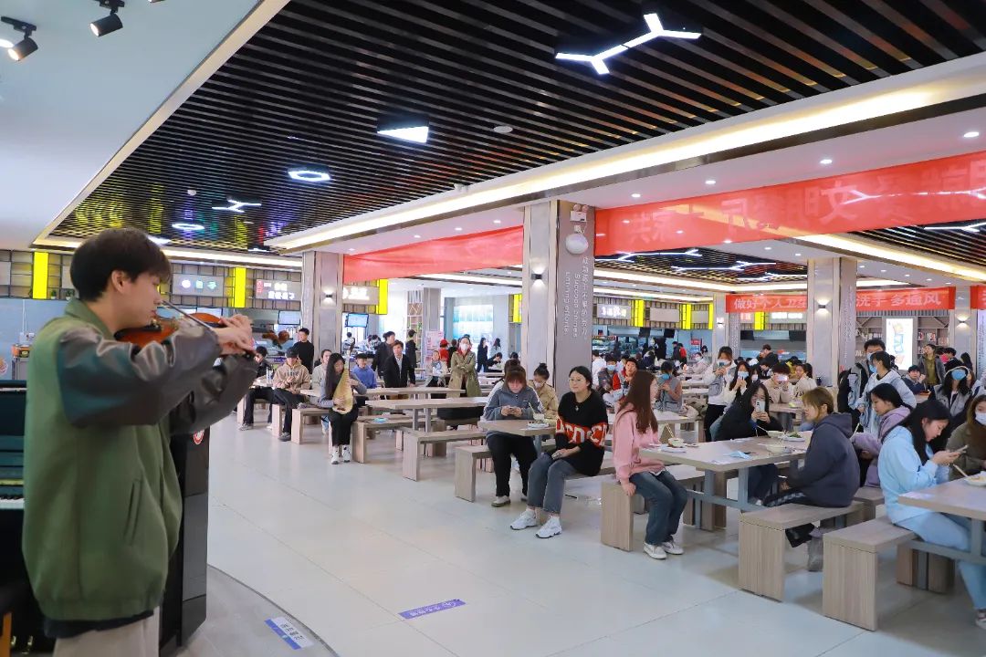 这是洛阳职业技术学院校园文化氛围营造的一项创新之举。近日,戏曲艺术学院将钢琴、小提琴等乐器搬进餐厅中,并组织音乐表演专业的学生在就餐时间进行演奏,既锻炼了学生们在公共场合的表演能力,也为广大师生送上一份音乐盛宴,让他们在日常生活中就能感受到艺术的魅力。