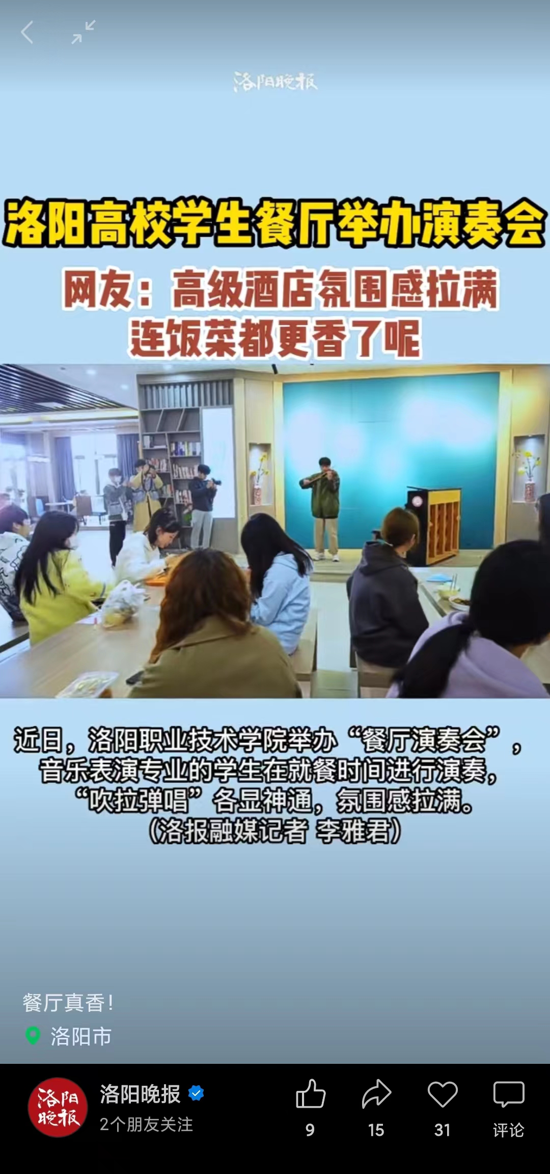 洛阳晚报视频号:洛阳高校学生餐厅举办演奏会