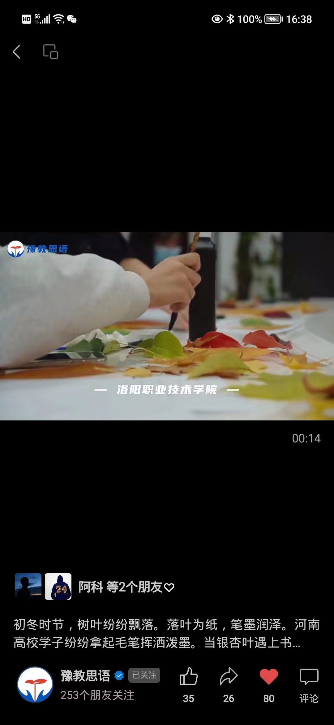 编者按:2022年11月23日,豫教思语微信视频号报道初冬时节,树叶纷纷飘落。落叶为纸,笔墨润泽。河南高校学子纷纷拿起毛笔挥洒泼墨。当银杏叶遇上书法,会碰撞出怎样的火花呢?跟随思语一起看看吧。,其中有我校学生作品。报道原文及相关链接如下: