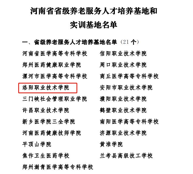 近日,河南省民政厅、河南省教育厅、河南省人力资源和社会保障厅联合下发《关于命名第一批省级养老服务人才培养基地和实训基地的通知》,我校成功入选河南省省级养老人才培养基地。