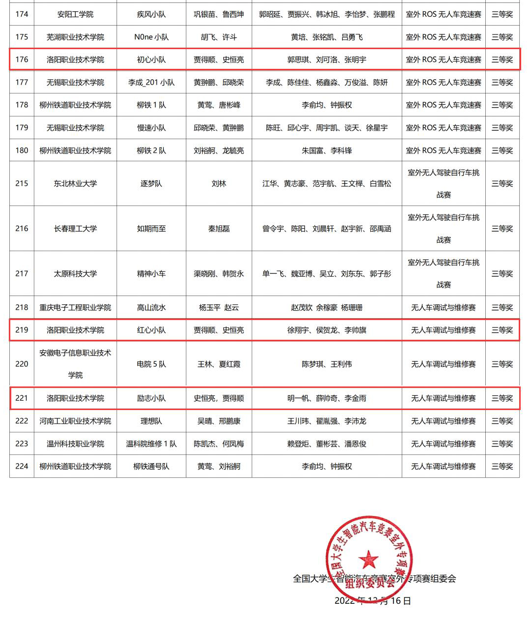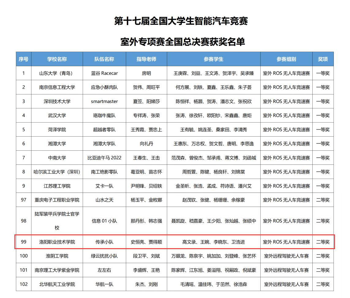 12月16日,第十七届全国大学生智能汽车竞赛室外专项赛全国总决赛获奖名单公布,我校共收获二等奖一项,三等奖三项。