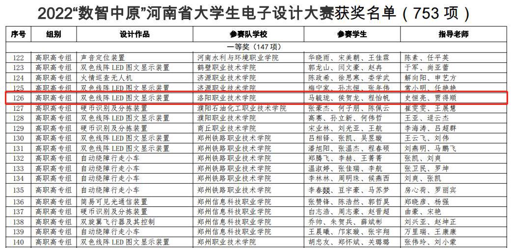 2022“数智中原”河南省大学生电子设计大赛由河南省教育厅主办,比赛设有高职高专、本科、研究生三个组,共分为单相逆变并网模拟装置、双输出DC/DCDC/AC变换器、自动绕障行走小车、双色线阵LED图文显示装置等10个题目,经学校推荐、专家组评审、组委会审核,最终产生一等奖147项,二等奖348项,三等奖258项。