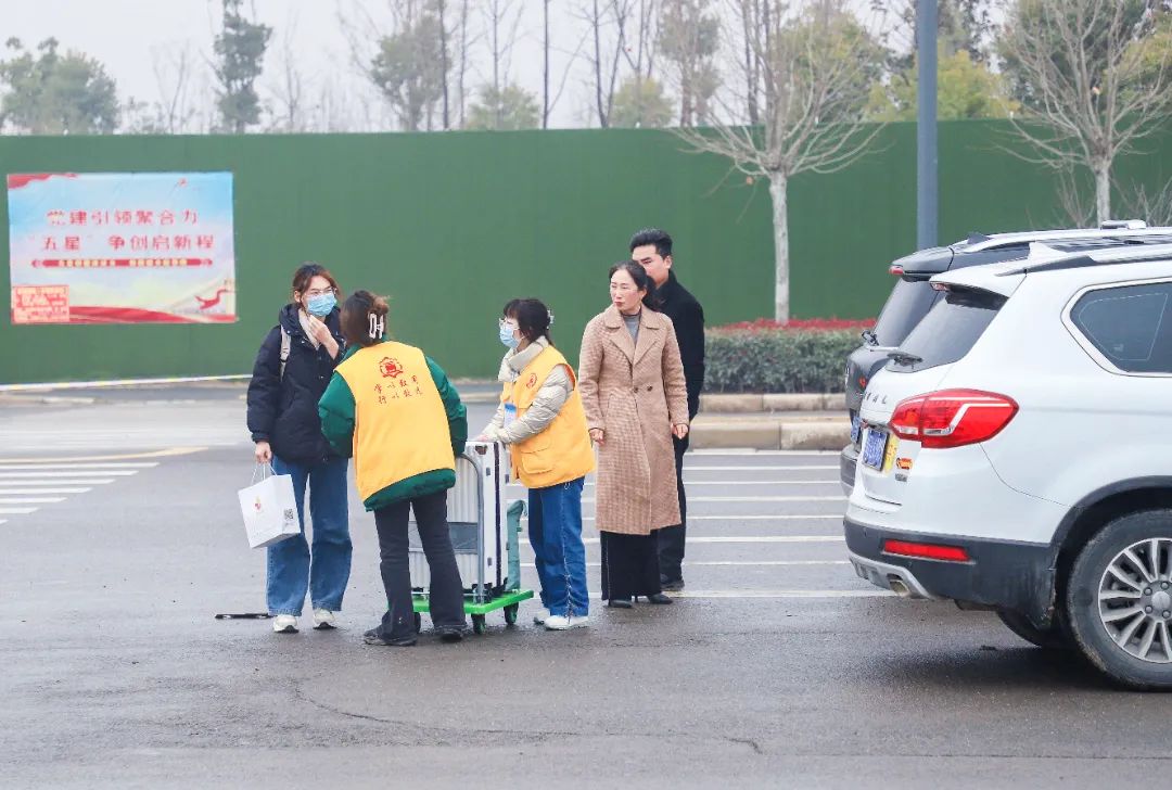 校园内,大量的学生志愿者帮助返校同学托运行李,提供帮助;宿舍管理员指导学生做好登记、统计学生返校数量,帮助学生有序进入宿舍。