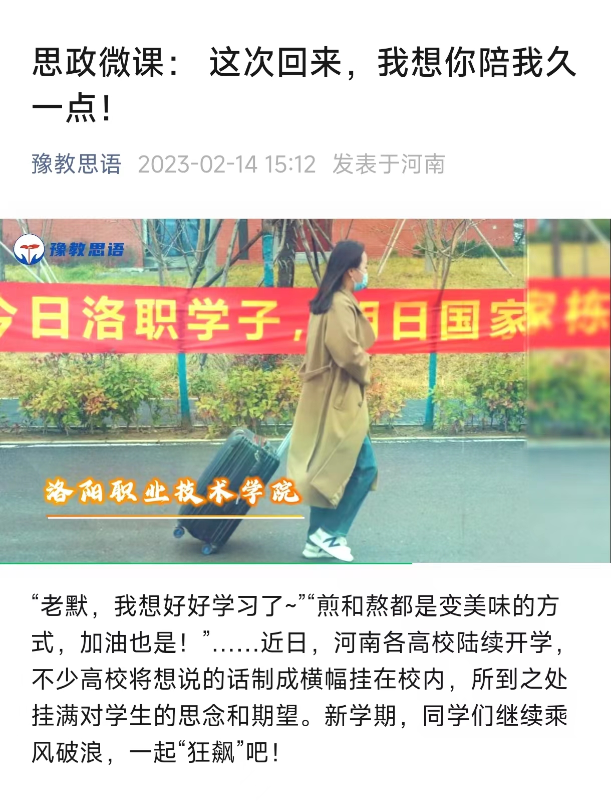 编者按:2023年2月14日,豫教思语:思政微课报道学生返校的美好时刻。报道原文及相关链接如下: