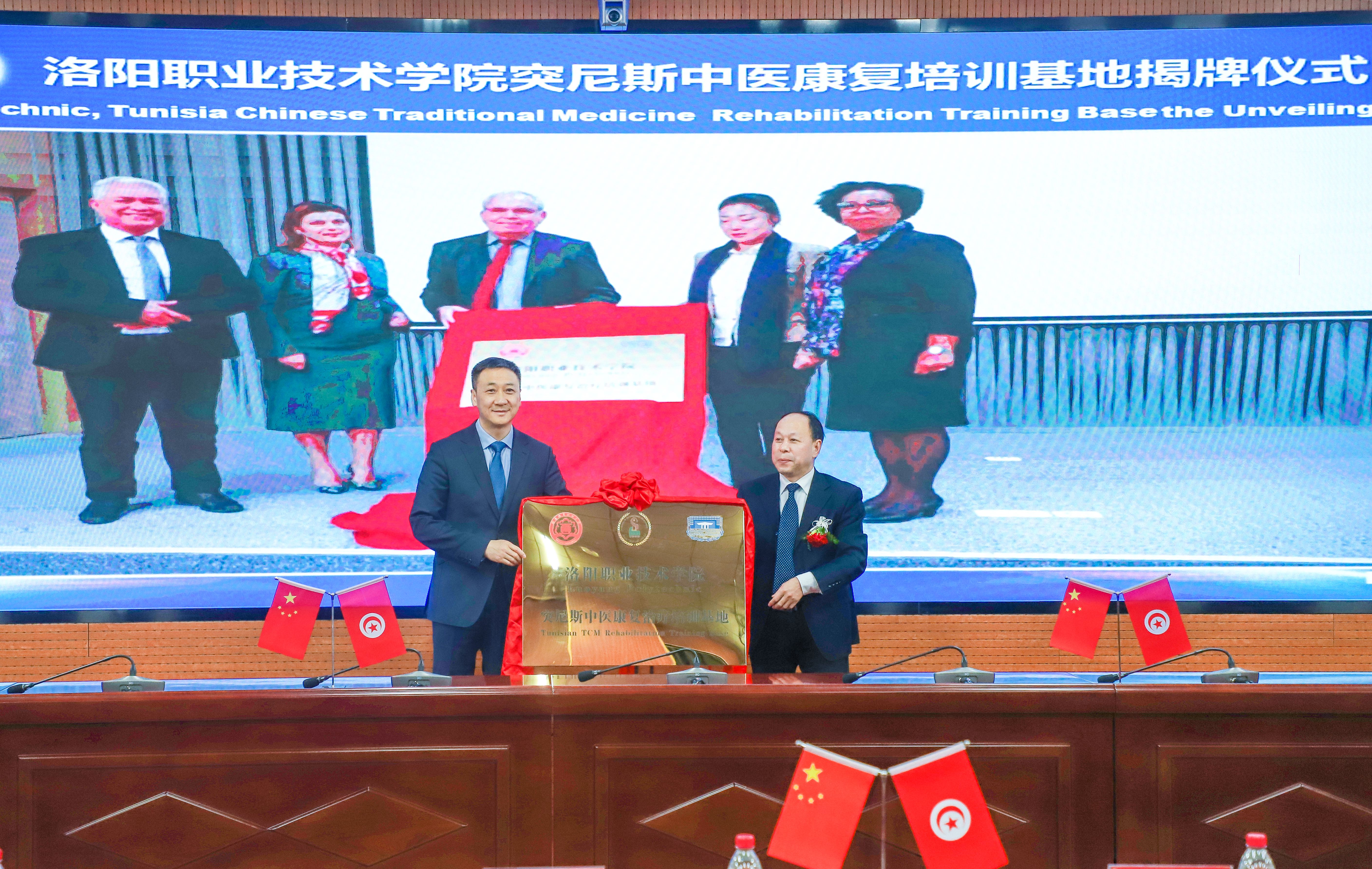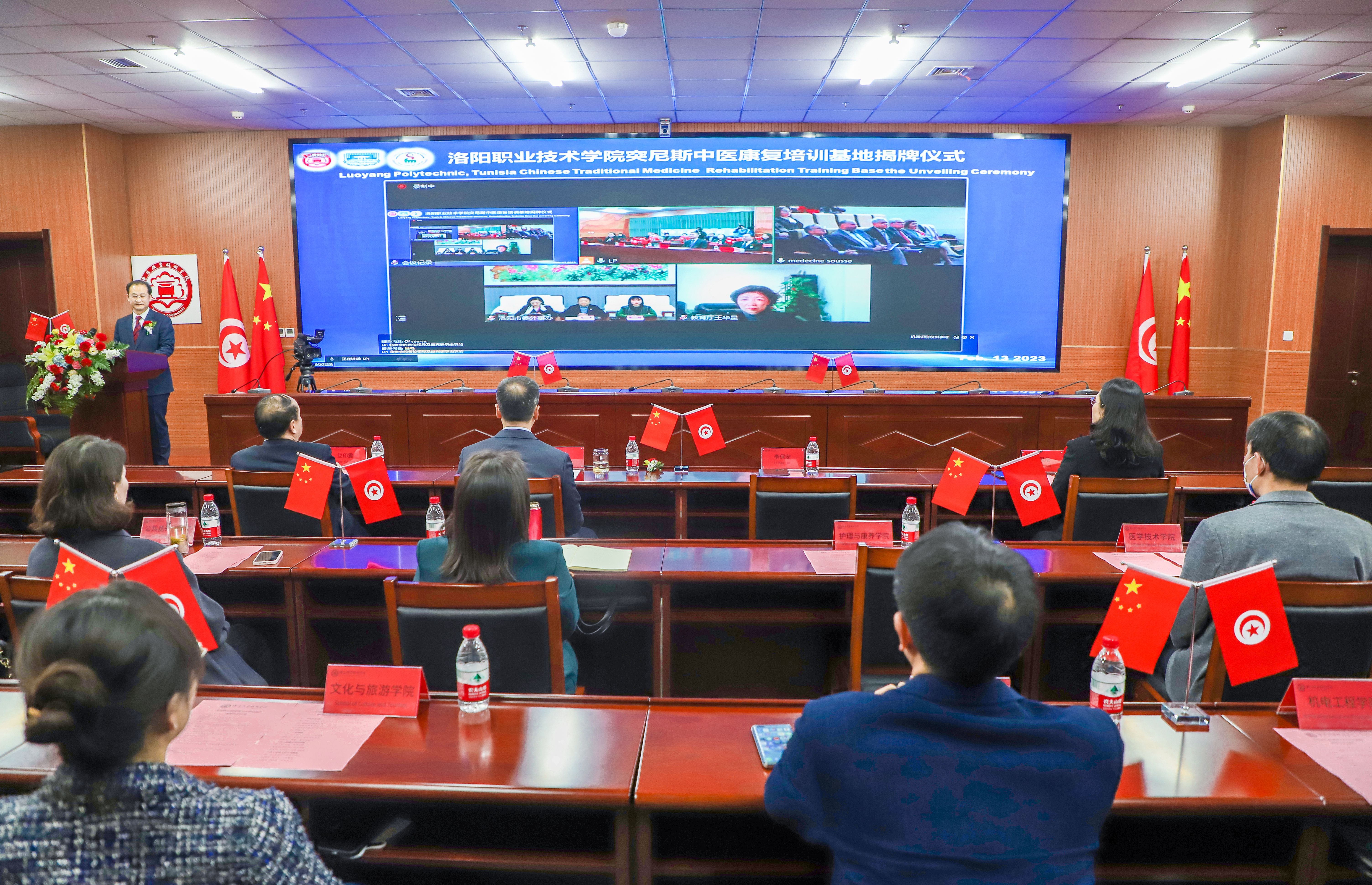 双方通过云端连线的方式共同为“洛阳职业技术学院-突尼斯中医康复治疗培训基地”揭牌。