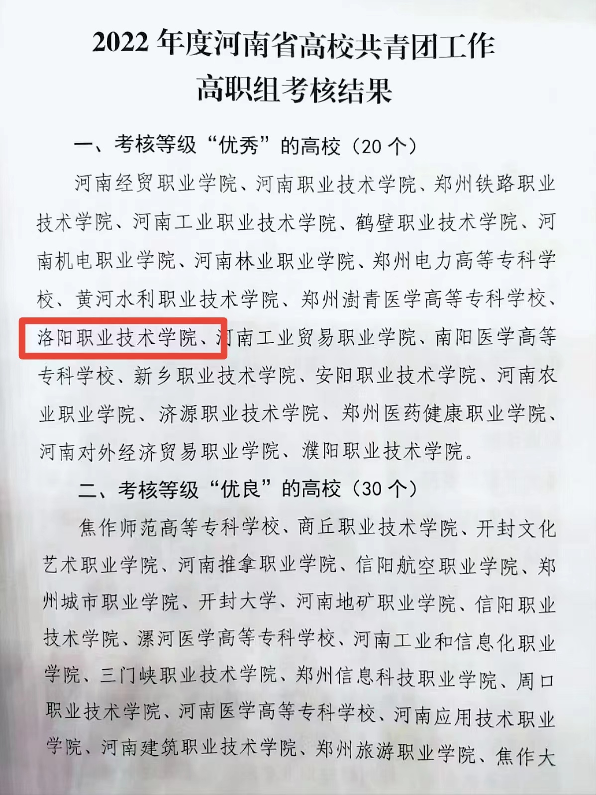 近日,共青团河南省委公布了2022年度河南省高校共青团工作考核结果,洛阳职业技术学院共青团工作在高职组考核中获评优秀。