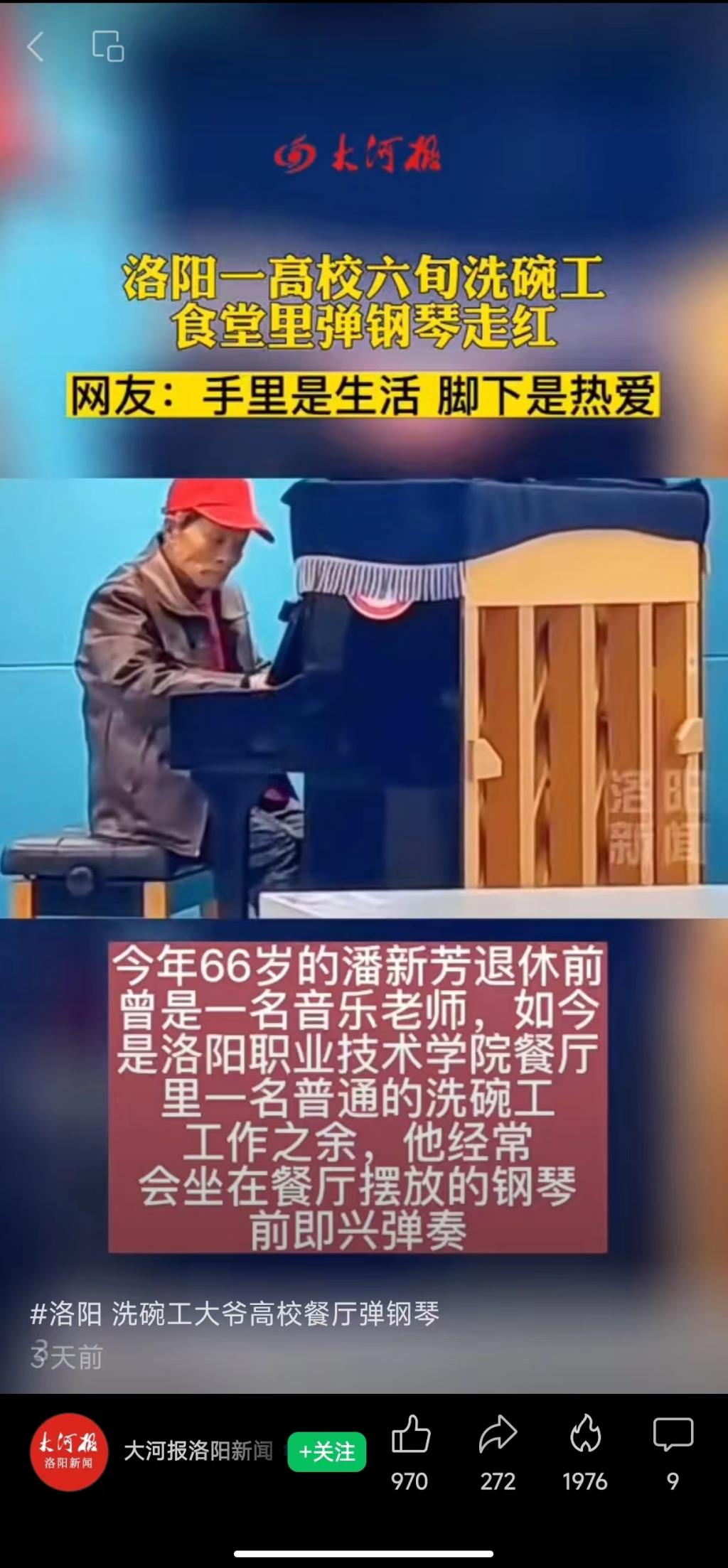 大河报洛阳新闻微信视频号:洗碗工大爷高校餐厅弹钢琴