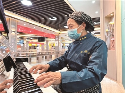 2023年2月27日9时许,记者来到洛阳职业技术学院餐厅。在餐厅最北侧,学校专门为学生们搭建了一个小舞台,舞台上摆放着一架钢琴。钢琴前,一个身材瘦小的大爷正专注地弹奏钢琴,他便是记者要见的人——潘新芳。