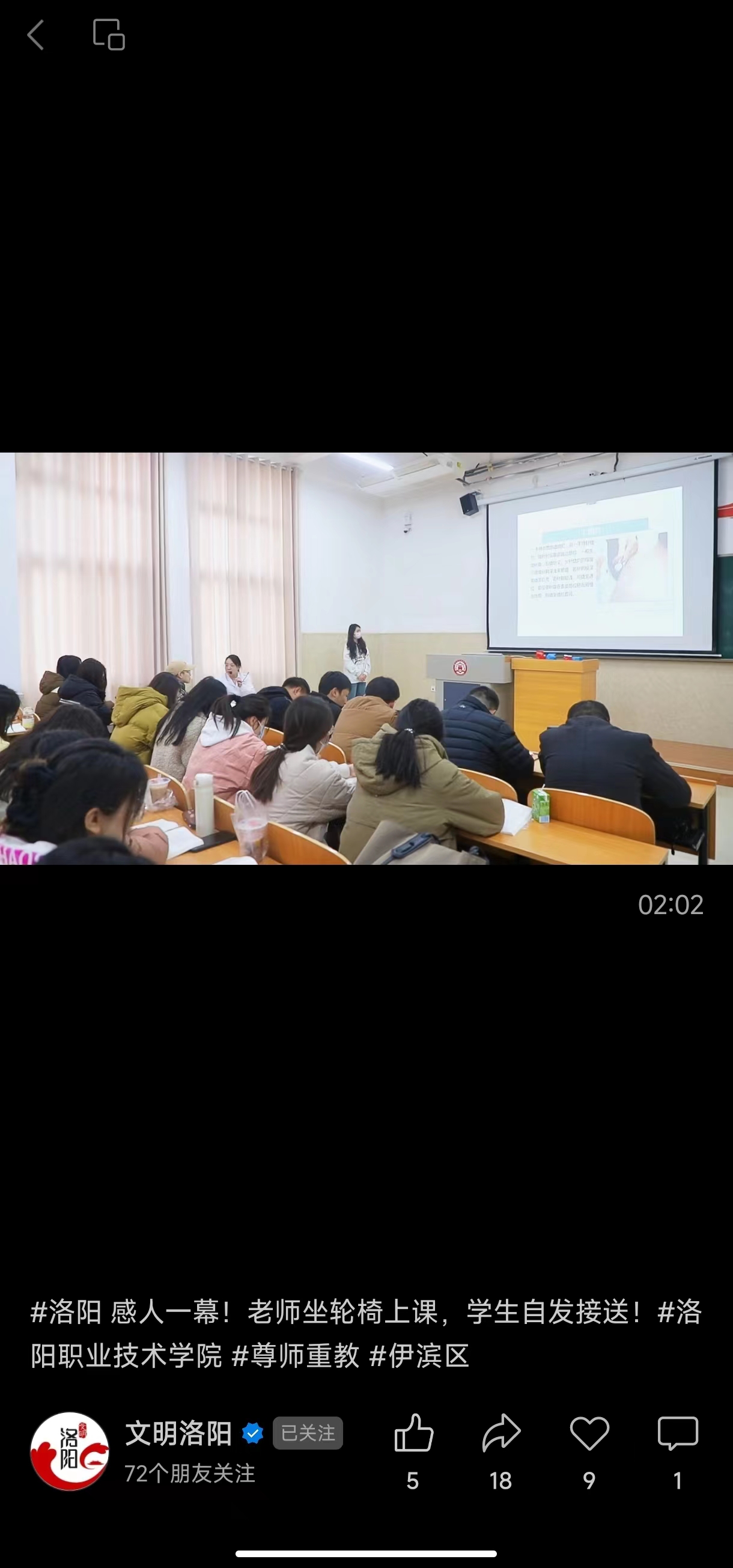 文明洛阳微信视频号;感人一幕!老师坐轮椅上课,学生自发接送!