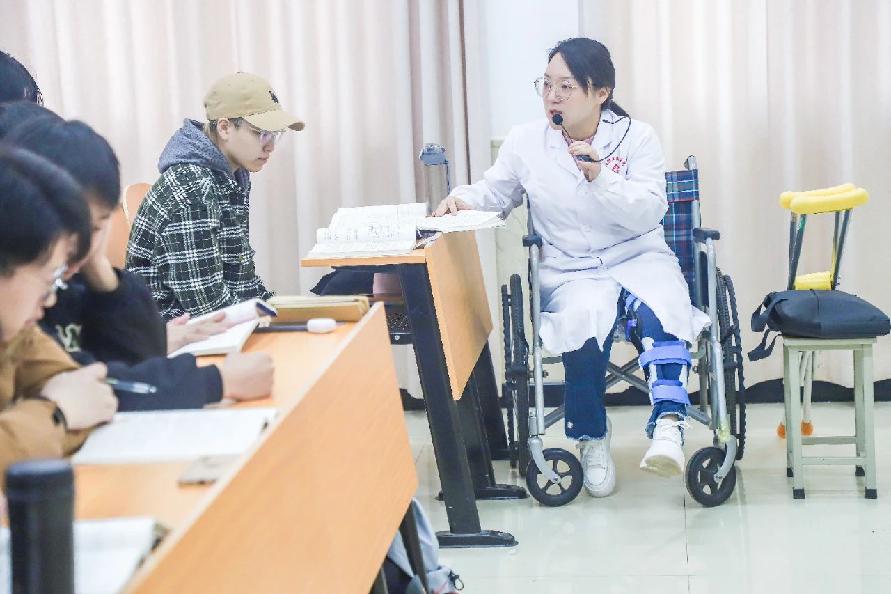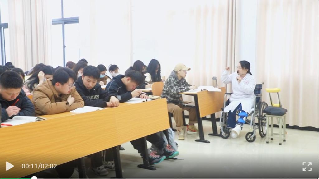 “我们现在讲的是火针疗法,在临床上,常用的消毒方式是碘伏消毒……”3月20日上午,洛阳职业技术学院二号教学楼305教室,一节特别的康复技术课正在进行。学生们发现,授课老师方飞宇并没有像往常一样站着给大家演示,而是坐在轮椅上,一手拿着教材,一手拿着麦克风,左腿上戴着厚厚的支具。