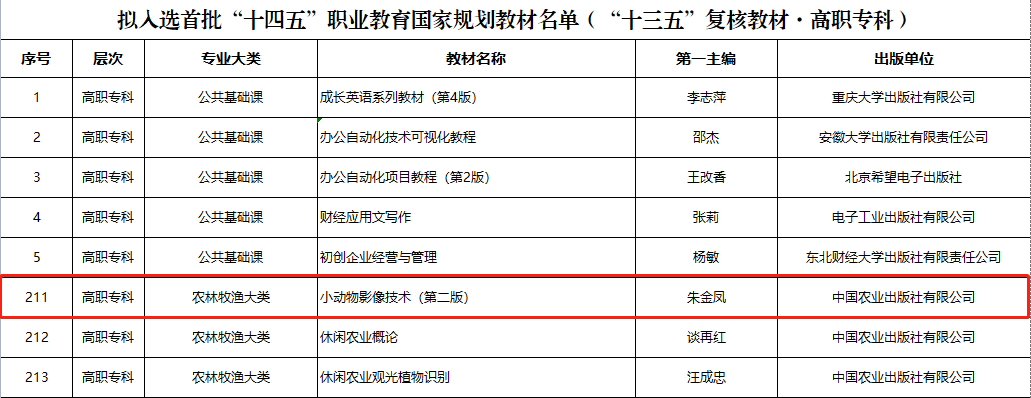 其中,朱金凤主编的《小动物影像技术(第二版)》(“十三五”复核教材)入选首批“十四五”职业教育国家规划教材。朱金凤和朱文文主编的《动物解剖》入选首批农业农村部"十四五"规划教材。