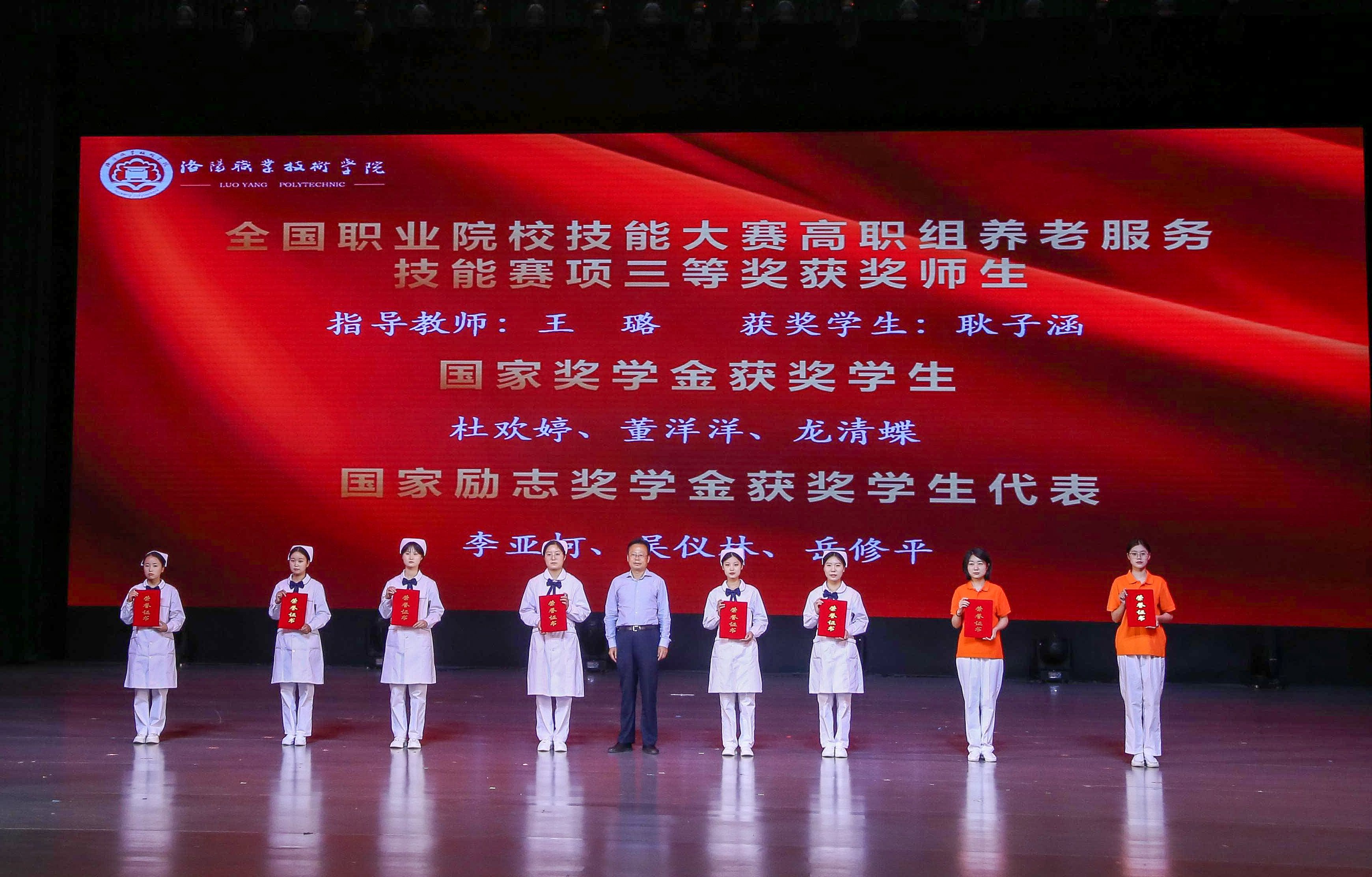 党委书记朱美荣、党委副书记任晓平、副校长张志友分别为全国职业院校技能大赛高职组养老服务技能赛项三等奖获奖师生、国家奖学金获奖学生、国家励志奖学金获奖学生代表、河南省高等职业教育技能大赛养老服务技能赛项一等奖获奖师生代表、洛阳市优秀共青团员等优秀师生代表颁奖。