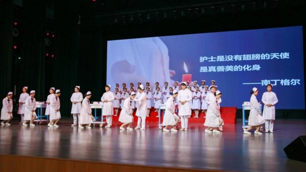 活动现场,护理与康养学院学生进行了双人心肺复苏术、老年人跌倒的预防及应急处理、产前运动指导等技能竞赛项目展示和护士礼仪表演,并通过舞蹈、歌曲、话剧精彩的文艺演出表达对护理人员的崇高敬意。