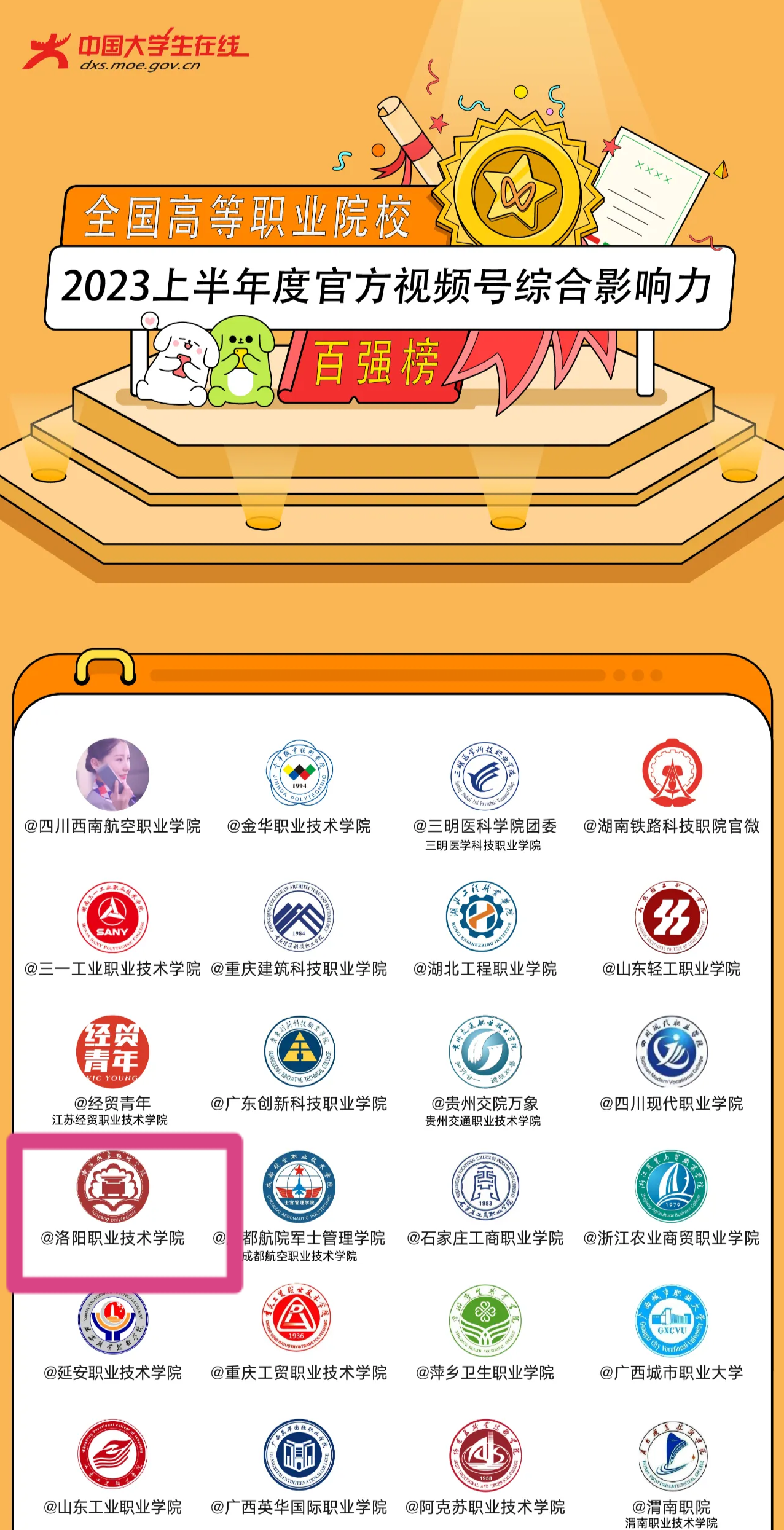 中国大学生在线微信公众号是由教育部主导并推动,全国大学生参与,全国高校合作共建的网络文化建设与主题教育平台,会定期对全国高校官方视频号、抖音号等新媒体平台综合影响力进行排名。在最新公布全国高等职业院校2023年上半年度官方视频号综合影响力百强榜单中,我校成功入选。
