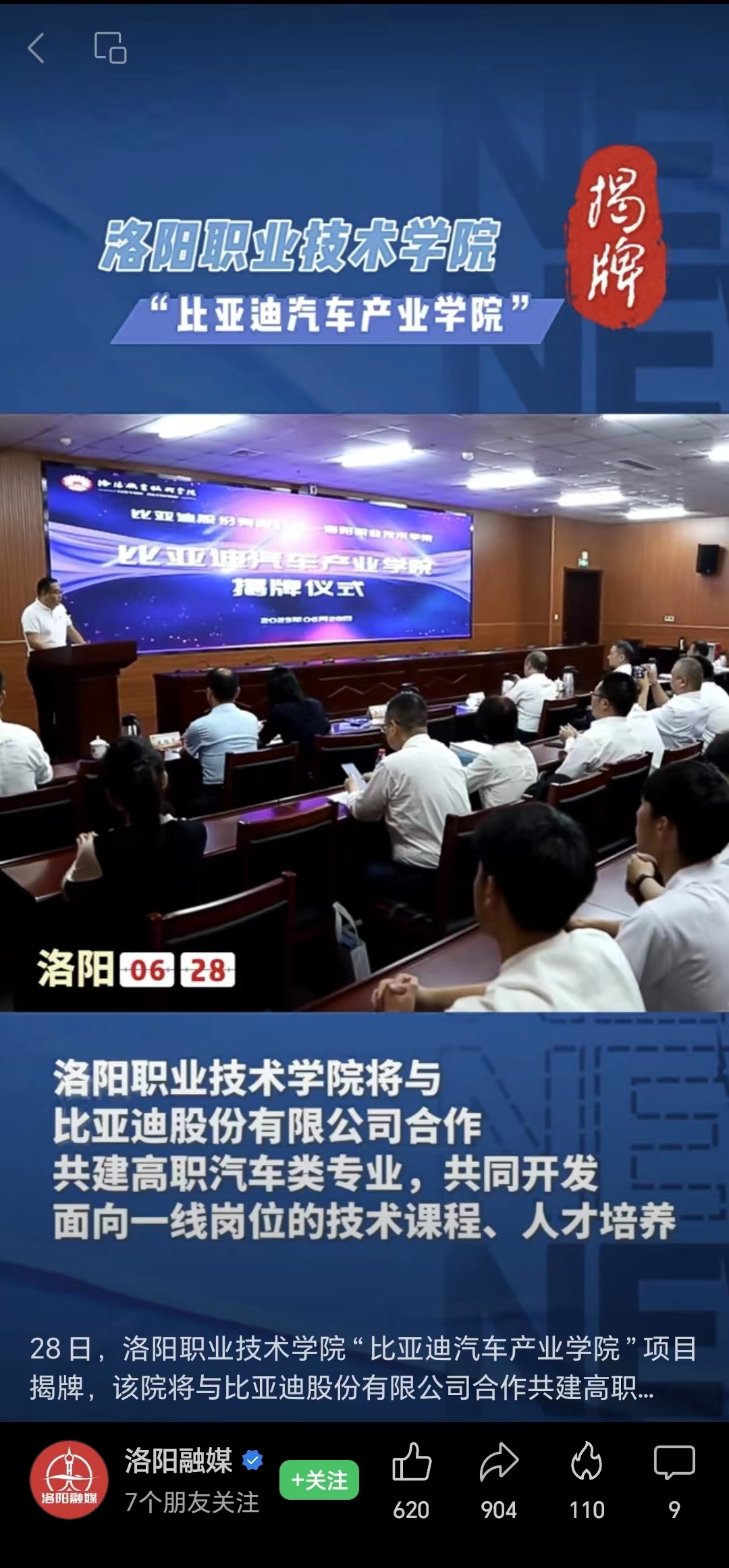 2023年6月28日,洛阳融媒报道我校“比亚迪汽车产业学院”项目揭牌。报道原文如下: