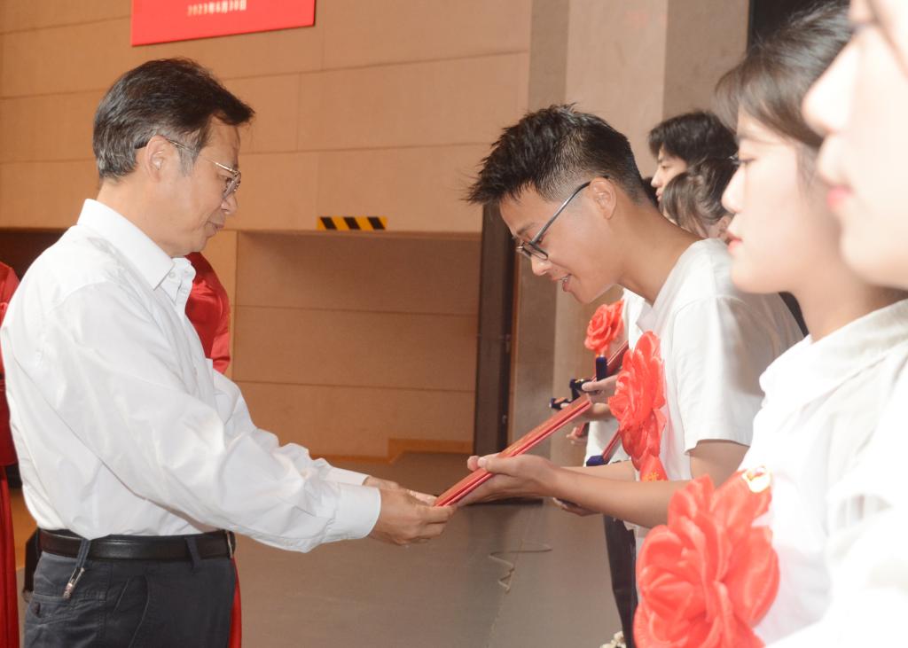 党委书记朱美荣为省级优秀毕业生代表颁发荣誉证书,赠送毕业纪念胸章。全体校领导为毕业生代表颁发毕业证书,为国家学生体质健康标准优秀等级学生代表颁发证书,并赠送毕业纪念胸章。