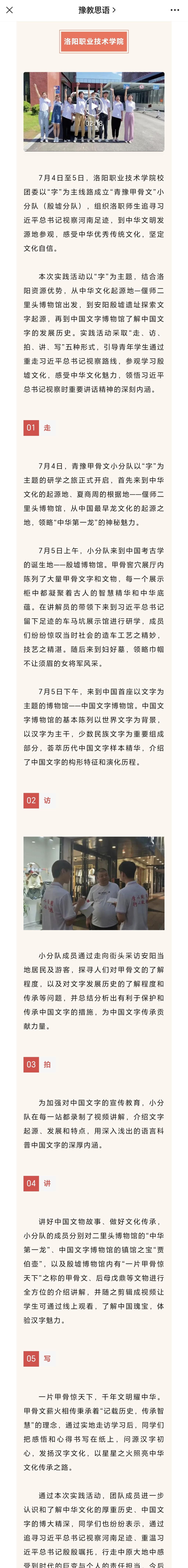 编者按:2023年7月28日,豫教思语报道今天,来看河南这5所高校暑期大思政实践活动(八)有关我校。报道原文及相关链接如下: