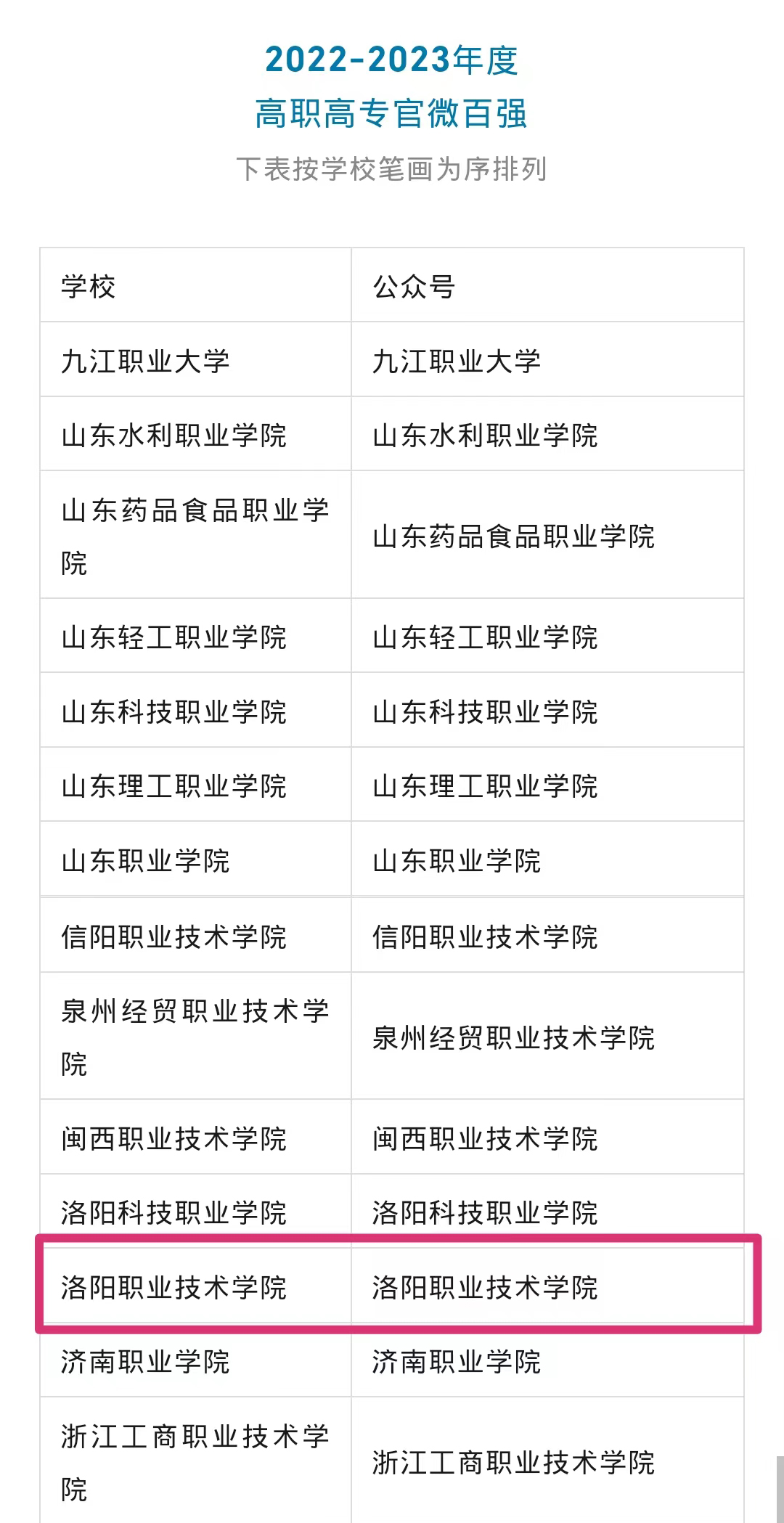 8月2日,中国青年报官方微信公众号公布了2022-2023年度中国大学官微百强名单、2022-2023年度全国高校可视化融媒团队名单。继入选2021-2022年度全国高职高专百强名单后,洛阳职业技术学院官方微信公众号再度跻身2022-2023年度全国高职高专官微百强名单。洛阳职业技术学院融媒体中心荣获2022-2023年度全国优秀职院可视化融媒团队。