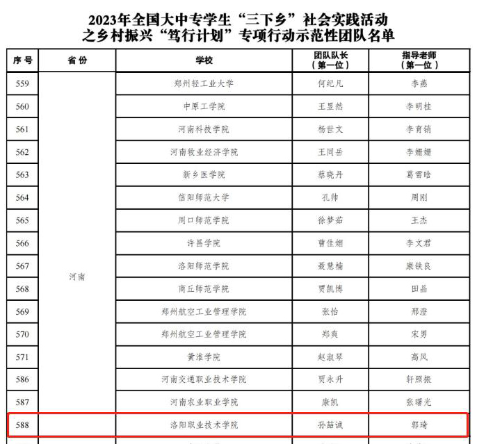 近日,共青团中央青年发展部公布了2023年全国大中专学生“三下乡”社会实践活动之乡村振兴“笃行计划”专项行动示范性团队名单,洛阳职业技术学院成功入选。