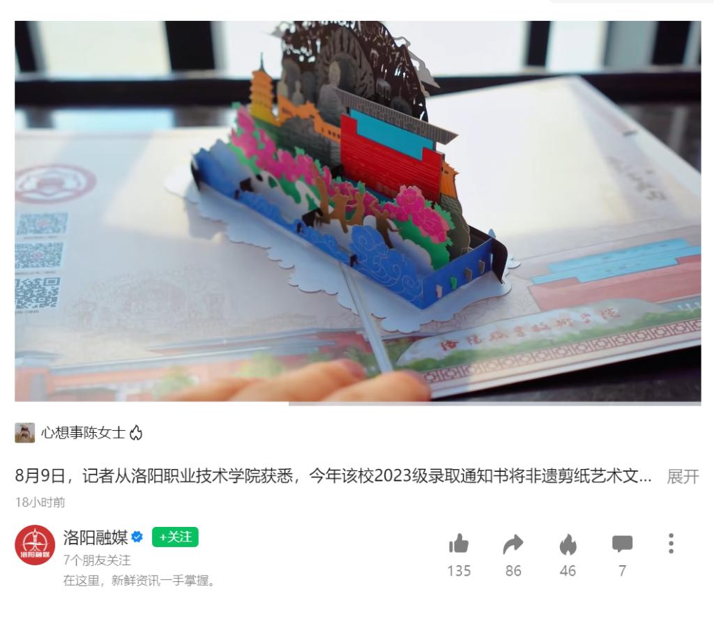 2023年8月9日,洛阳融媒微信视频号报道我校2023级录取通知书将非遗剪纸艺术文化与雕刻技术完美结合。报道原文如下:
