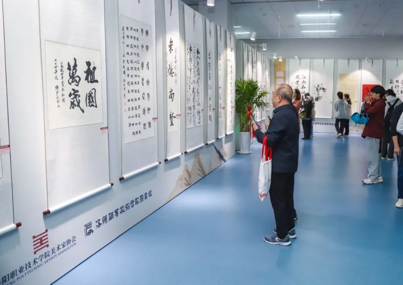 会后,庆祝中华人民共和国成立74周年暨洛阳职业技术学院书法家协会、美术家协会成立书画作品展在图书馆三楼开展。
