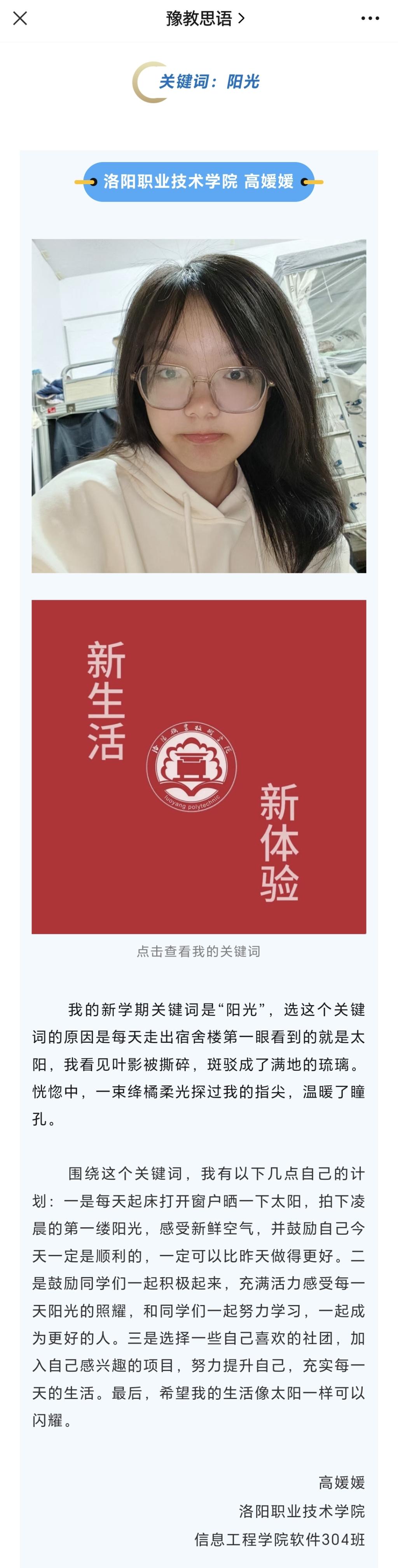 编者按:2023年10月19日,豫教思语报道青年说 | 探索、体验、热爱......解锁大一新生的校园生活关键词其中有我校学子。报道原文及相关链接如下: