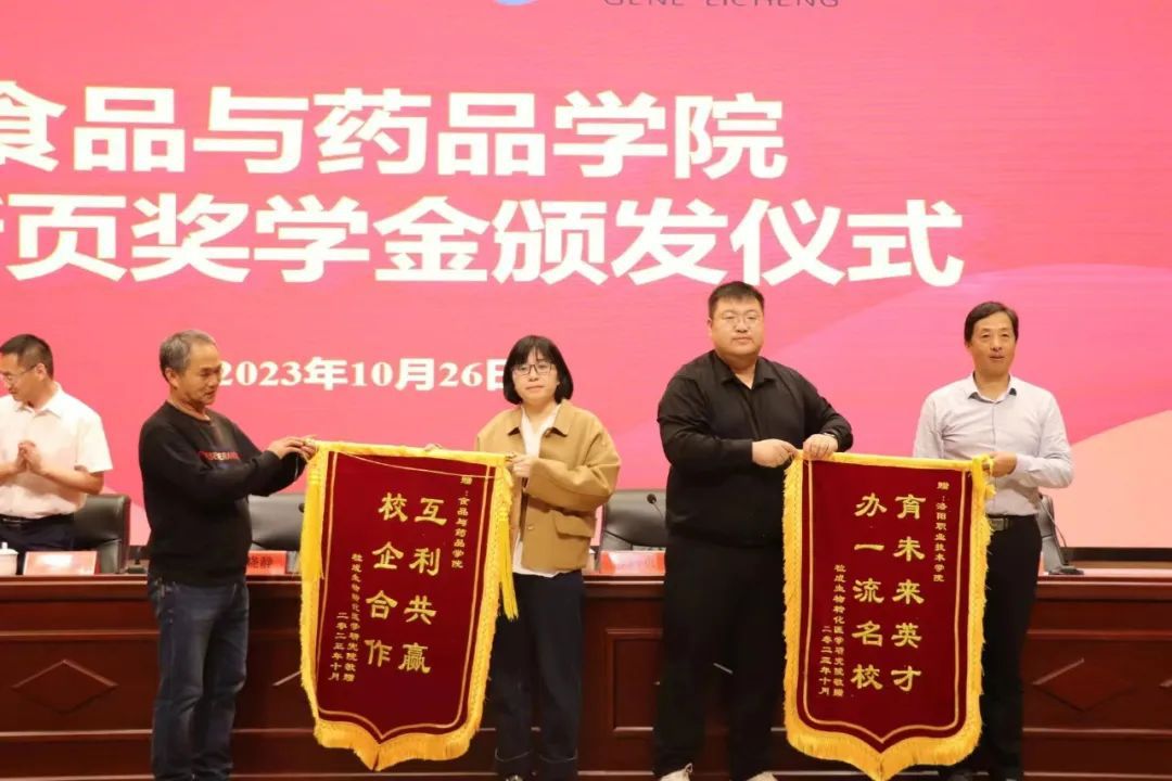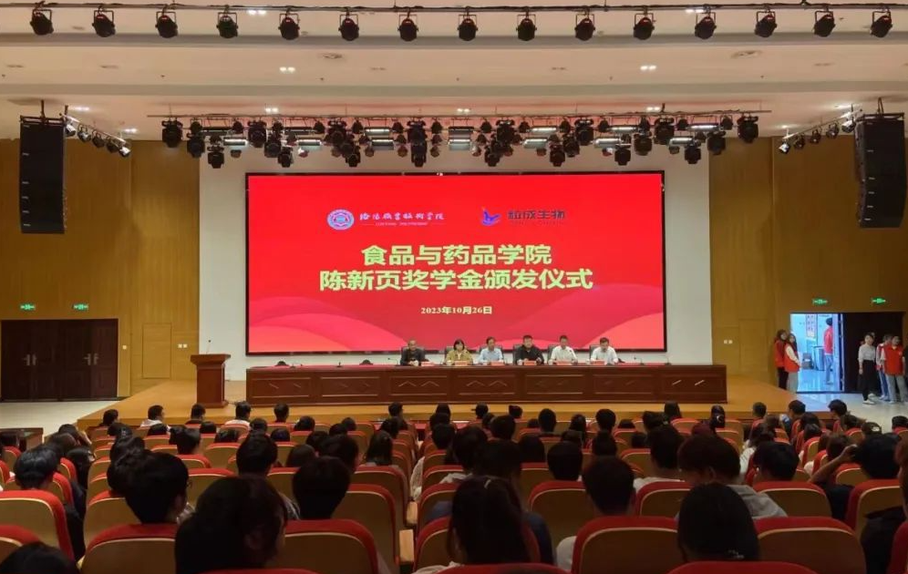 10月26日中午,食品与药品学院“陈新页奖学金”颁发仪式在大学生活动中心一楼报告厅举行。上海粒成生物科技有限公司董事长陈新页、技术总监张晓静,食品与药品学院党总支书记李红卫、党总支副书记兼副院长张贺伟、党总支副书记张俊峰,以及师生代表参加仪式 。
