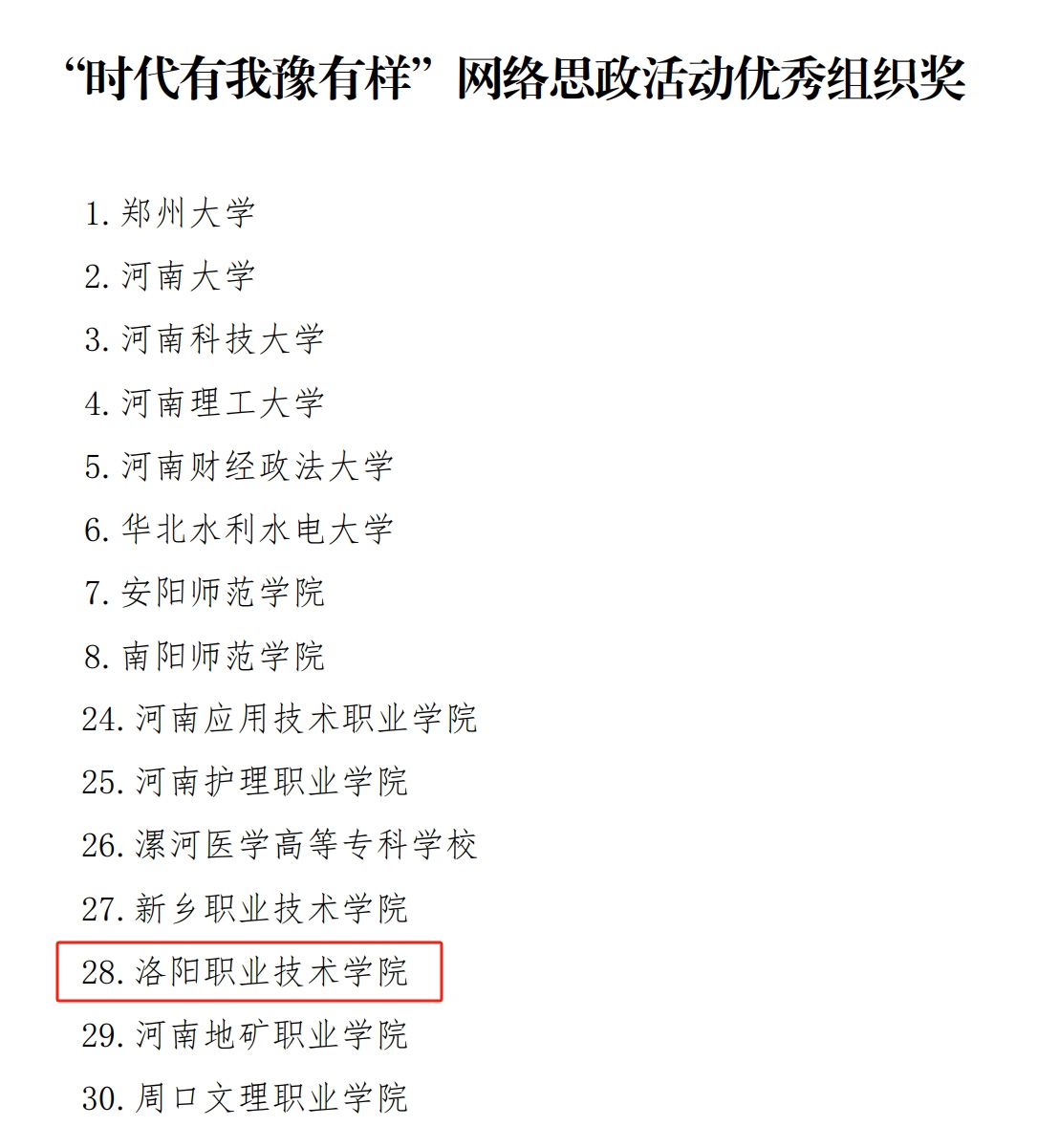 近日,省委教育工委、省教育厅公布“时代有我豫有样”网络思政活动获奖结果,我校荣获优秀组织奖,食品与药品学院老师柴雪莹荣获先进个人奖,融媒体中心记者团成员赵欢荣获人气之星奖。