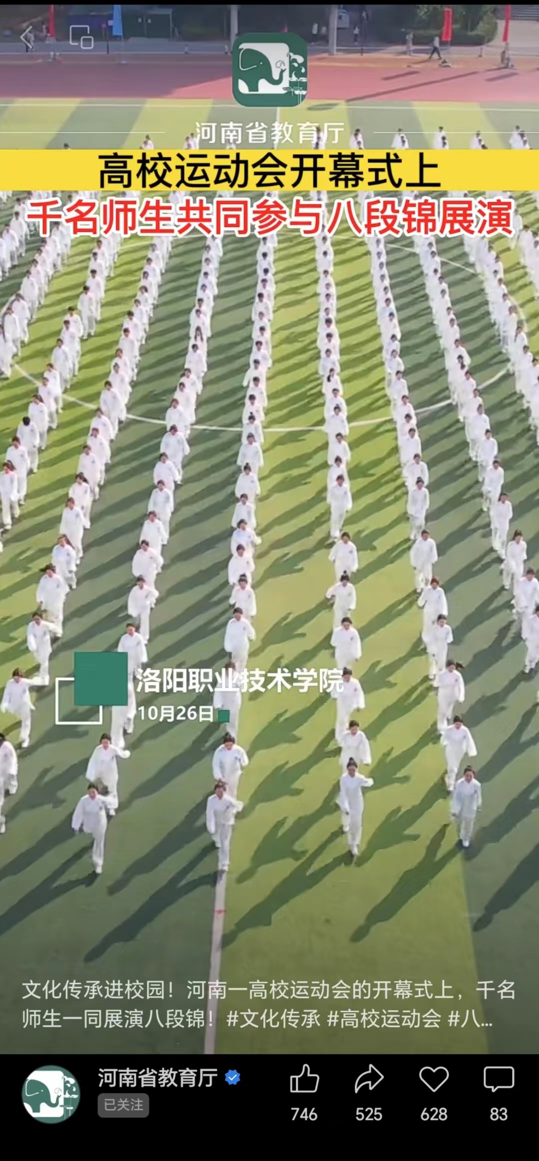 2023年10月30日,河南省微信视频号报道文化传承进校园!我校运动会的开幕式上,千名师生一同展演八段锦!报道原文如下: