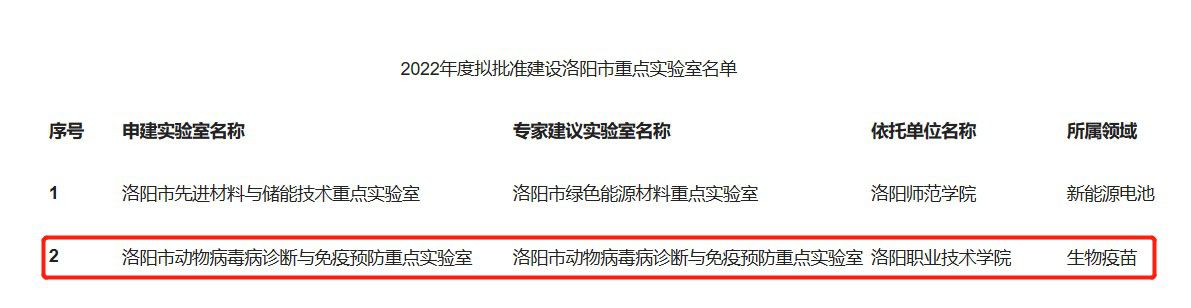 近日,洛阳市科技局公示了《2022年度拟批准建设的洛阳市重点实验室名单》,本次共有8个实验室获批建设,我校食品与药品学院申报的《洛阳市动物病毒病诊断与免疫预防重点实验室》位列其中。