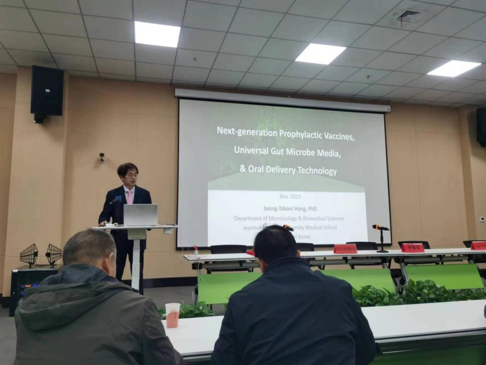 Hong Seongtshool以《下一代预防性疫苗、通用肠道微生物培养基和口服给药技术》为题,围绕 COVID-19肠道微生物疫苗、流感病毒肠道微生物疫苗、肠道微生物通用培养基、SFTS的mRNA疫苗、口服给药平台QUOD等方面开展讲座。与会教师与Hong Seongtshool就科研中遇到的疑难问题进行了深入交流。