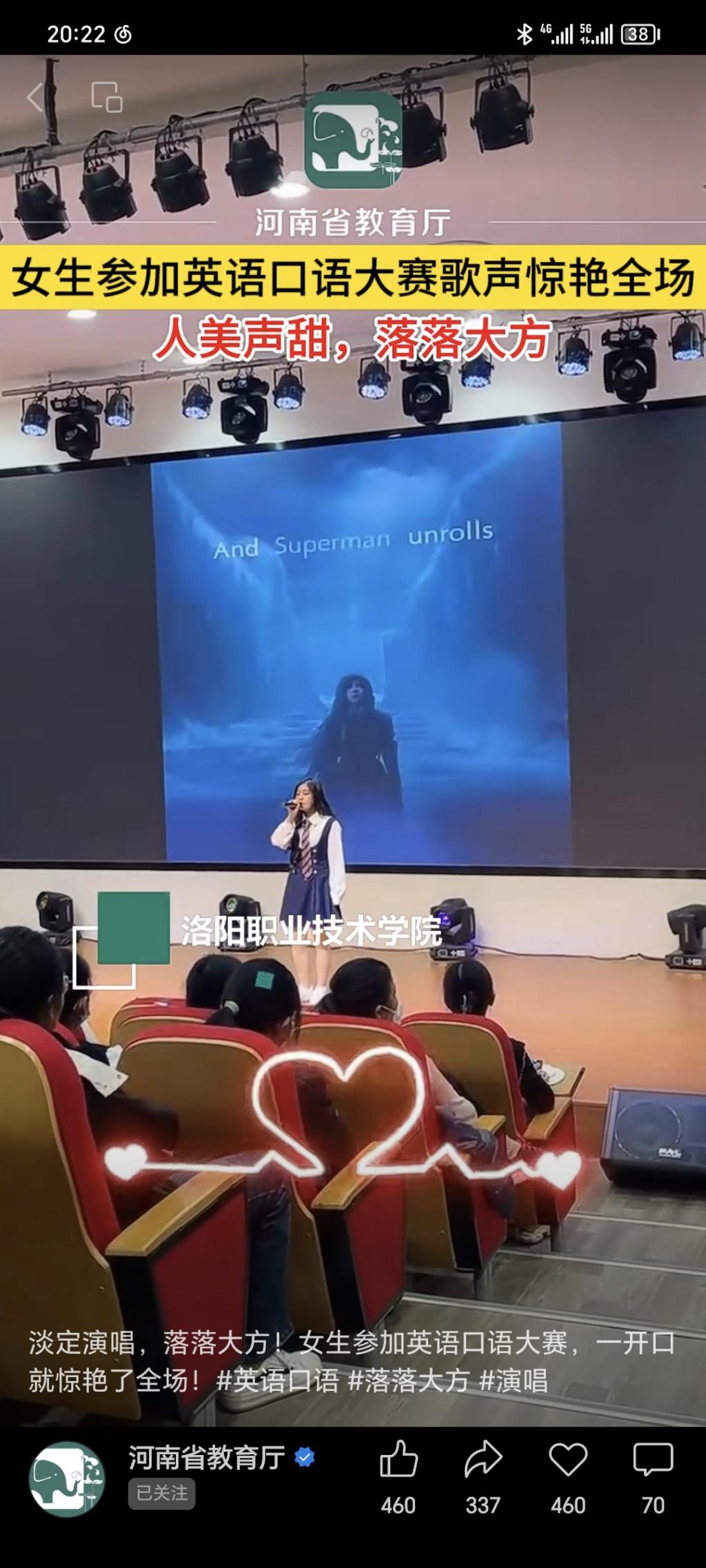2023年11月20日,河南省教育厅微信视频号报道淡定演唱,落落大方!我校女生参加英语口语大赛,一开口就惊艳了全场!报道原文如下: