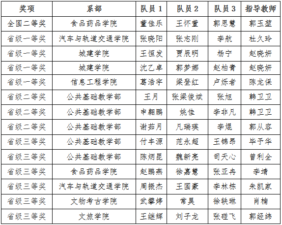 2023年全国大学生数学建模竞赛河南赛区共有88所院校、2872个代表队参加比赛,其中有23个参赛队获得全国一等奖,75个参赛队获得全国二等奖。河南赛区专科组一等奖71队,二等奖86队,三等奖89队。在各二级教学单位的积极参与下,我校今年共有35支代表队参赛,14支代表队获奖。其中,食品与药品学院1支代表队获全国二等奖,来自汽车与轨道交通学院、城建学院、信息工程学院的4支代表队获省级一等奖,来自公共基础教学部的3支代表队获省级二等奖,来自公共基础教学部、食品与药品学院、汽车与轨道交通学院、文物保护考古学院、文化与旅游学院的6支代表队获省级三等奖。